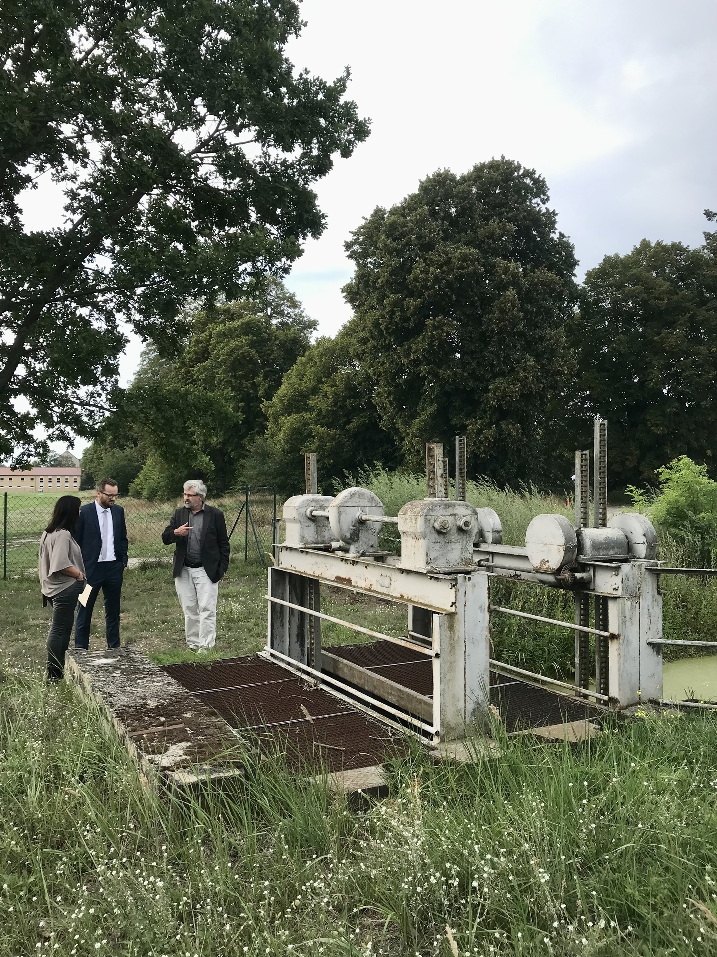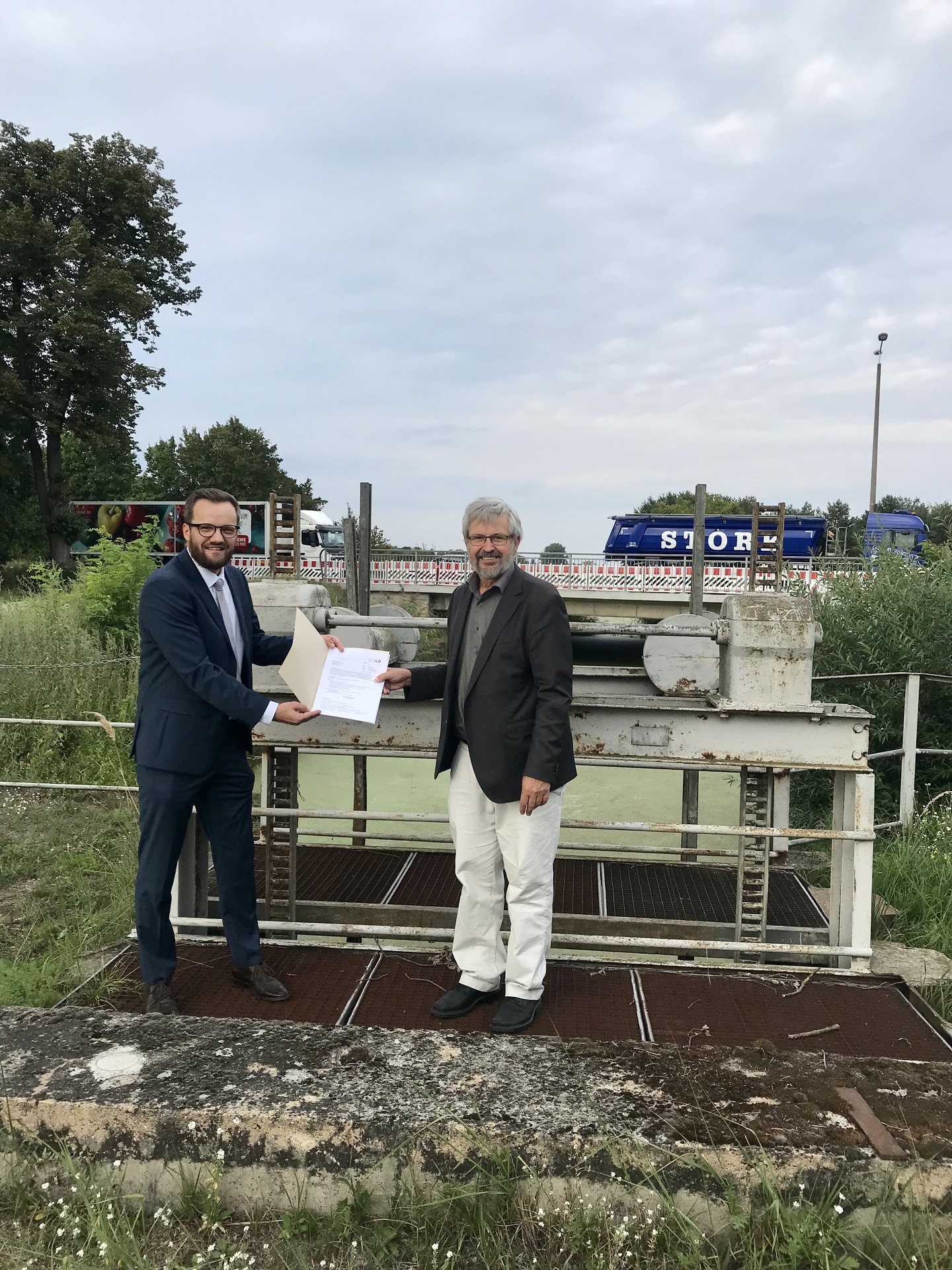 Umweltminister Axel Vogel überreichte bei einem Vor-Ort-Termin mit Bürgermeister Michael Müller einen Zuwendungsbescheid für die Rekonstruktion des Wehrs am Neujahrsgraben.