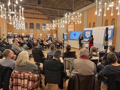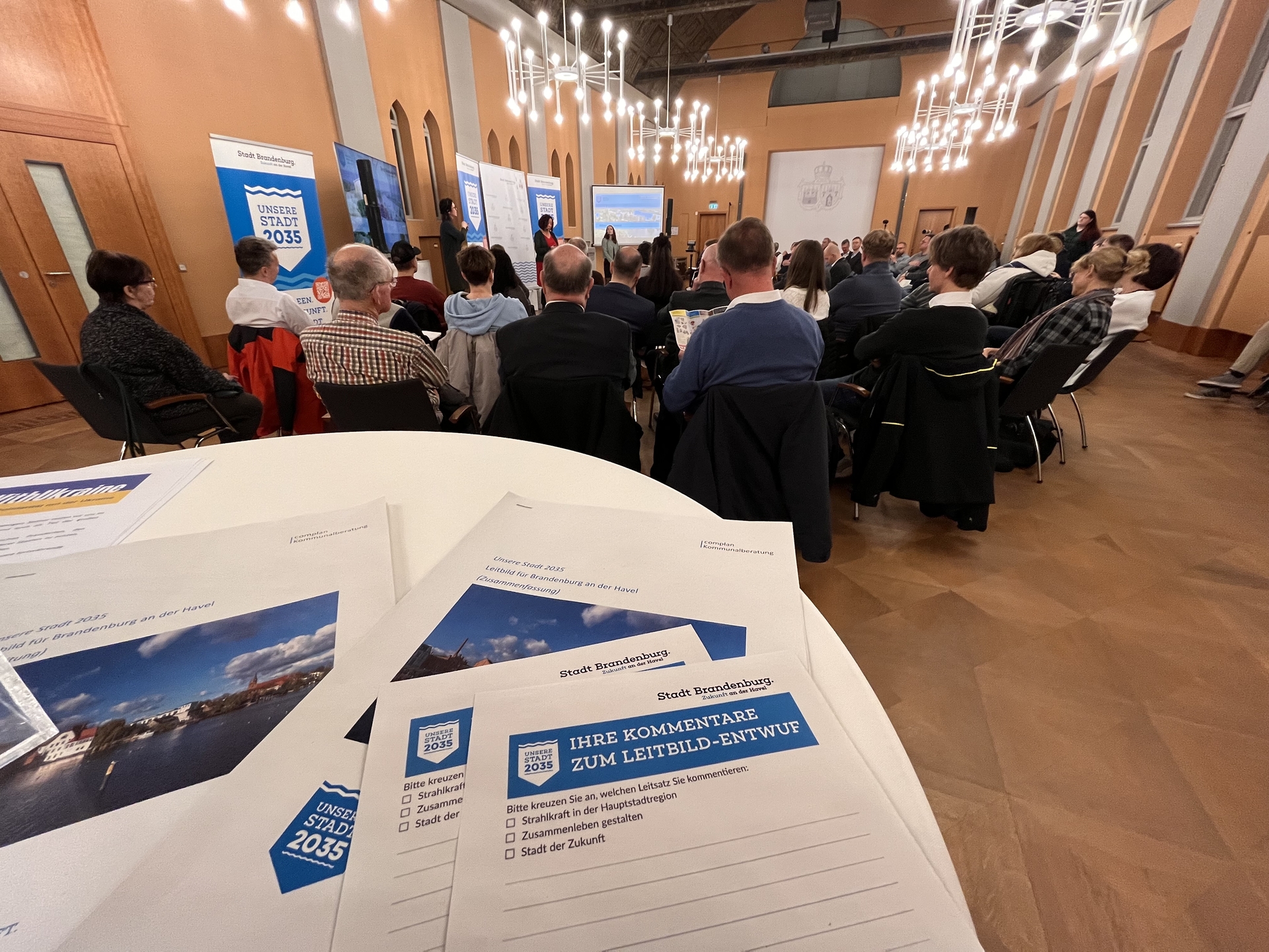 Fast 70 Brandenburgerinnen und Brandenburger haben am Donnerstagabend, 23. Februar 2023, die Möglichkeit genutzt, live in der Abschlusveranstaltung zum Leitbildprozess „Unsere Stadt 2035“ im Rolandsaal den Entwurf kennenzulernen. Gut 90 Menschen haben zudem den Livestream verfolgt. Die Agentur stellte die einzelnen Thesen des Entwurfs vor und erläuterte die Herleitung anhand von in der Ideenphase eingereichten Bürgerkommentaren.