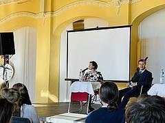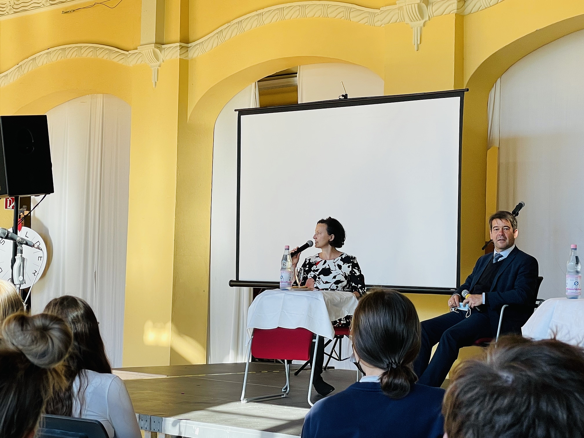 Im Anschluss ging es gemeinsam zum von Saldern- Gymnasium Europaschule. Nach der Begrüßung durch Direktor Frank Brandt suchte die Gesandte das Gespräch und den Wissensaustausch mit Schülerinnen und Schülern der 11. Klasse.