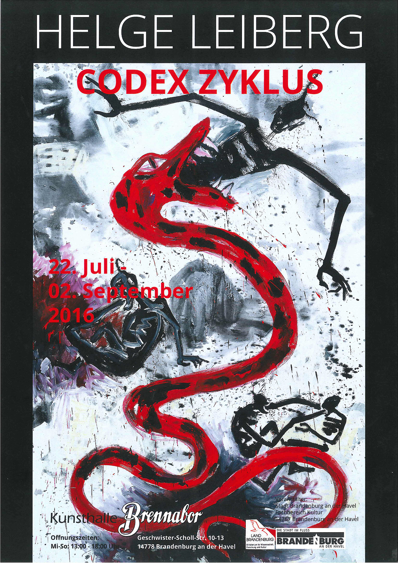 Leibergs Codex-Zyklus, 15 Bilder umfassend, alle je 3 x 2 Meter groß, wird vom 23. Juli bis zum 2. September 2016 in der Kunsthalle Brennabor gezeigt, gefördert vom Ministerium für Wissenschaft, Forschung und Kultur des Landes Brandenburg und unterstützt vom Freundeskreis der Kunsthalle.