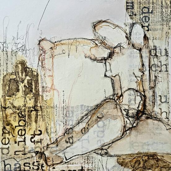 In ihrer aktuellen Ausstellung präsentiert Bettina Engel Arbeiten, die von literarischen Texten inspiriert sind. Ihre Grafiken verbinden Bilder mit Schriftfragmenten und bilden die Grundlage für die Serie „Transkription“, in der sie sich besonders mit den lyrischen Texten von Thomas Brasch auseinandersetzt.