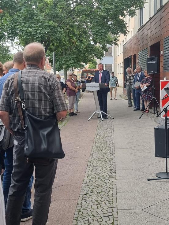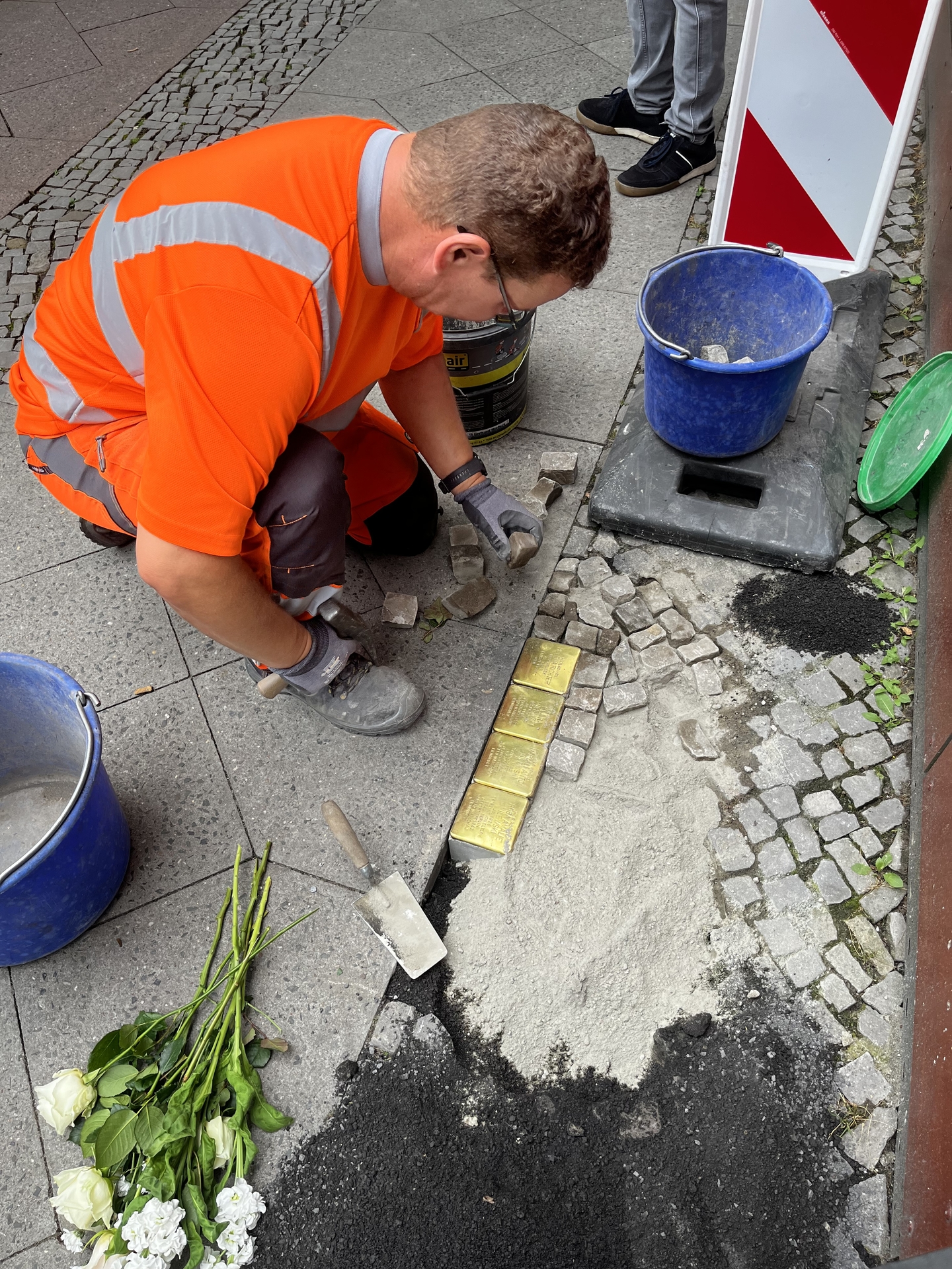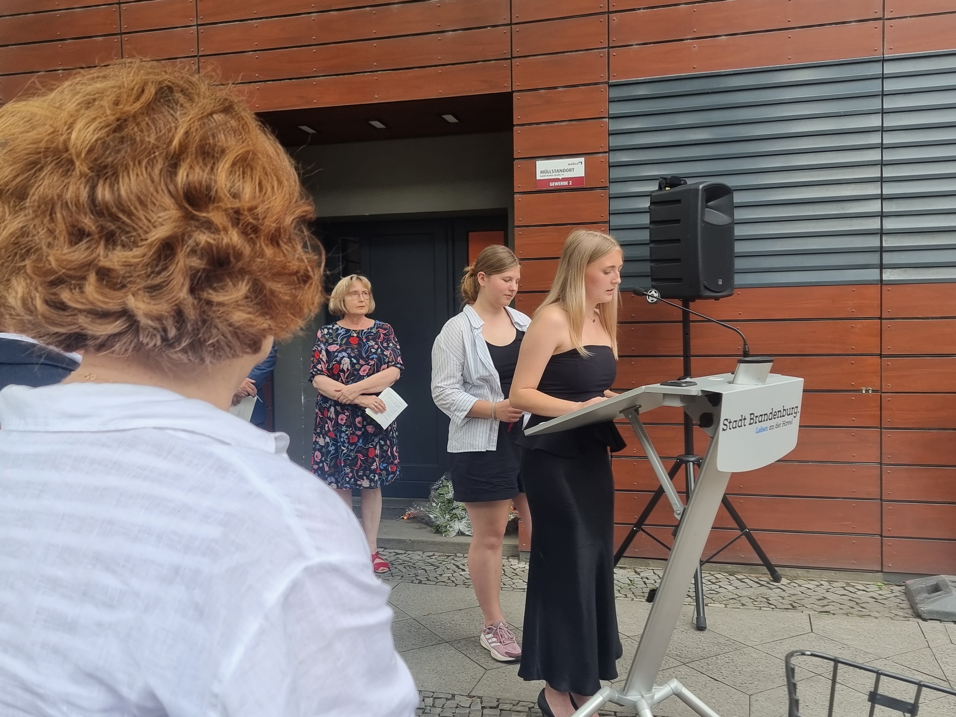 Im Rahmen eines Gedenkens und der Verlegung von vier weiteren Stolpersteinen in der Stadt Brandenburg an der Havel, kamen am Dienstag, 16. Juli 2024, Initiatoren und Initiatorinnen, Projektbeteiligte, Schülerinnen und Schüler des Dom-Gymnasiums und Mitarbeiterinnen und Mitarbeiter der Stadtverwaltung und Interessierte an der Sankt-Annen-Straße 14 zusammen.