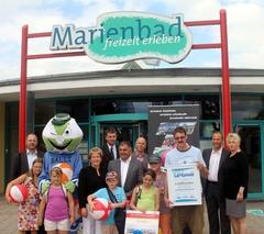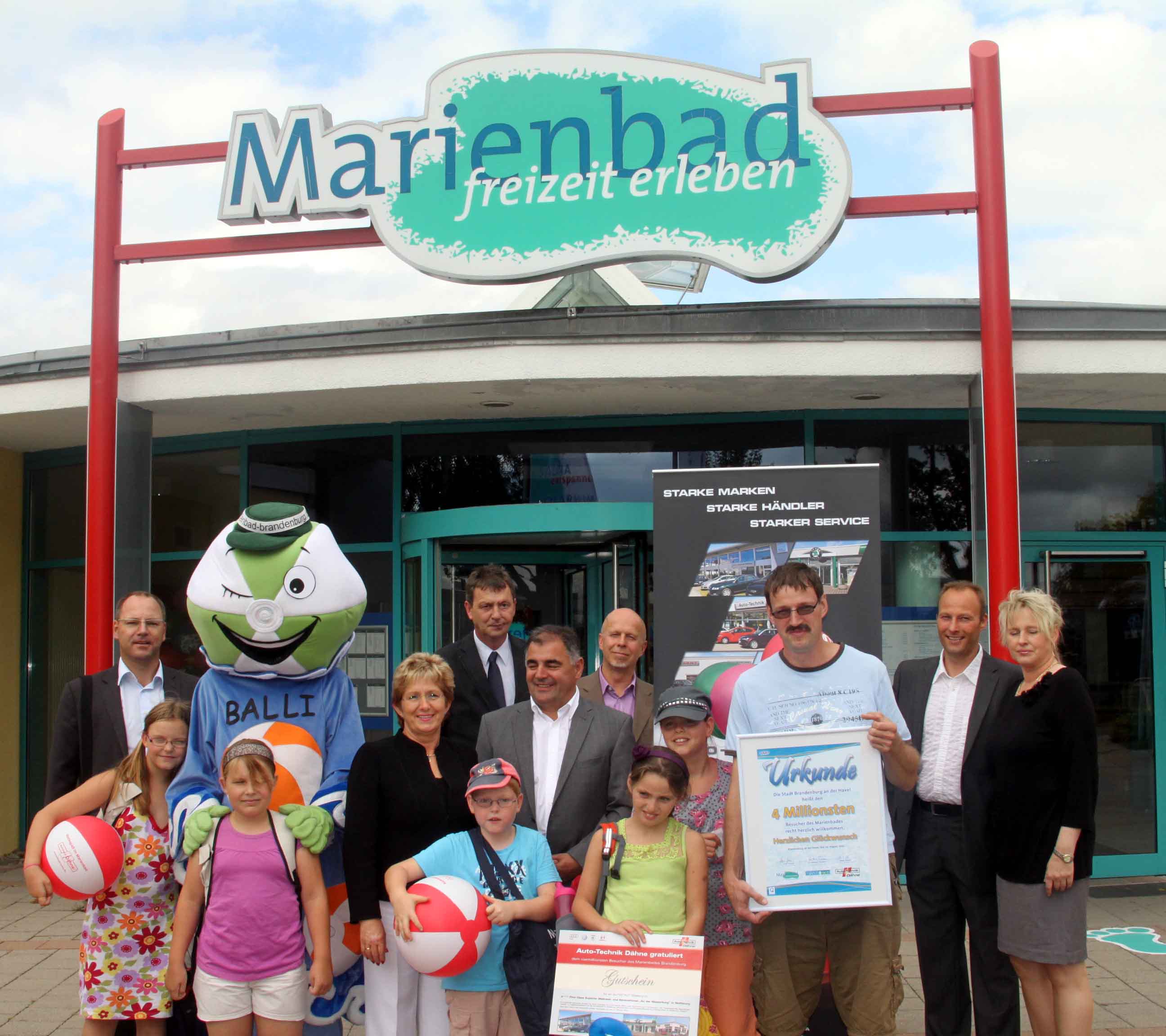 Jens Schmidt aus Krahne war heute der viermillionste Besucher des Marienbades. Oberbürgermeisterin Dr. Dietlind Tiemann, gratulierte ihm und seinen drei Kindern zum Jubiläumsbesuch. Zu den Gratulanten gehörten auch Werkleiter Fred Ostermann, Wolfgang Debus, Projektleiter Betriebsführer GMF sowie Betriebsleiter Jens Grosser.