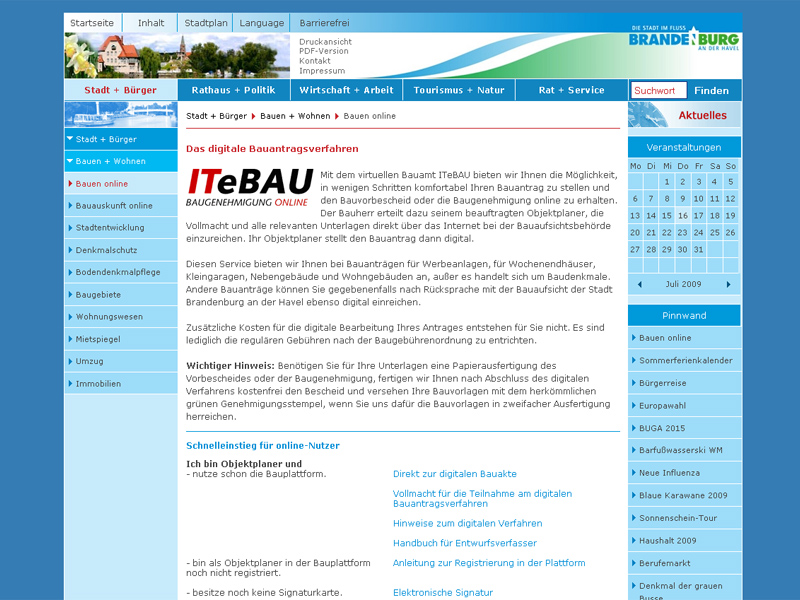 Zusammen mit profilierten IT-Dienstleistern, wie der ITEBO GmbH Osnabrück, sowie den Städten Osnabrück und Braunschweig und dem Landkreis Osnabrück hat die Stadt Brandenburg an der Havel das Virtuelle Bauamt ITEBau entwickelt, das nicht nur die digitale Antragstellung ermöglicht, sondern auch alle weiteren Beteiligungs- und Bearbeitungsabläufe in digitaler Form. Als Medium für den Daten- und Kommunikationsfluss wurde eine frei zugängliche und flexibel nutzbare Internetplattform gewählt, die sich bereits bei großen Organisationsprojekten der Privatwirtschaft bewährt hat und dem komplexen öffentlichen Bauantragsverfahren angepasst wurde.