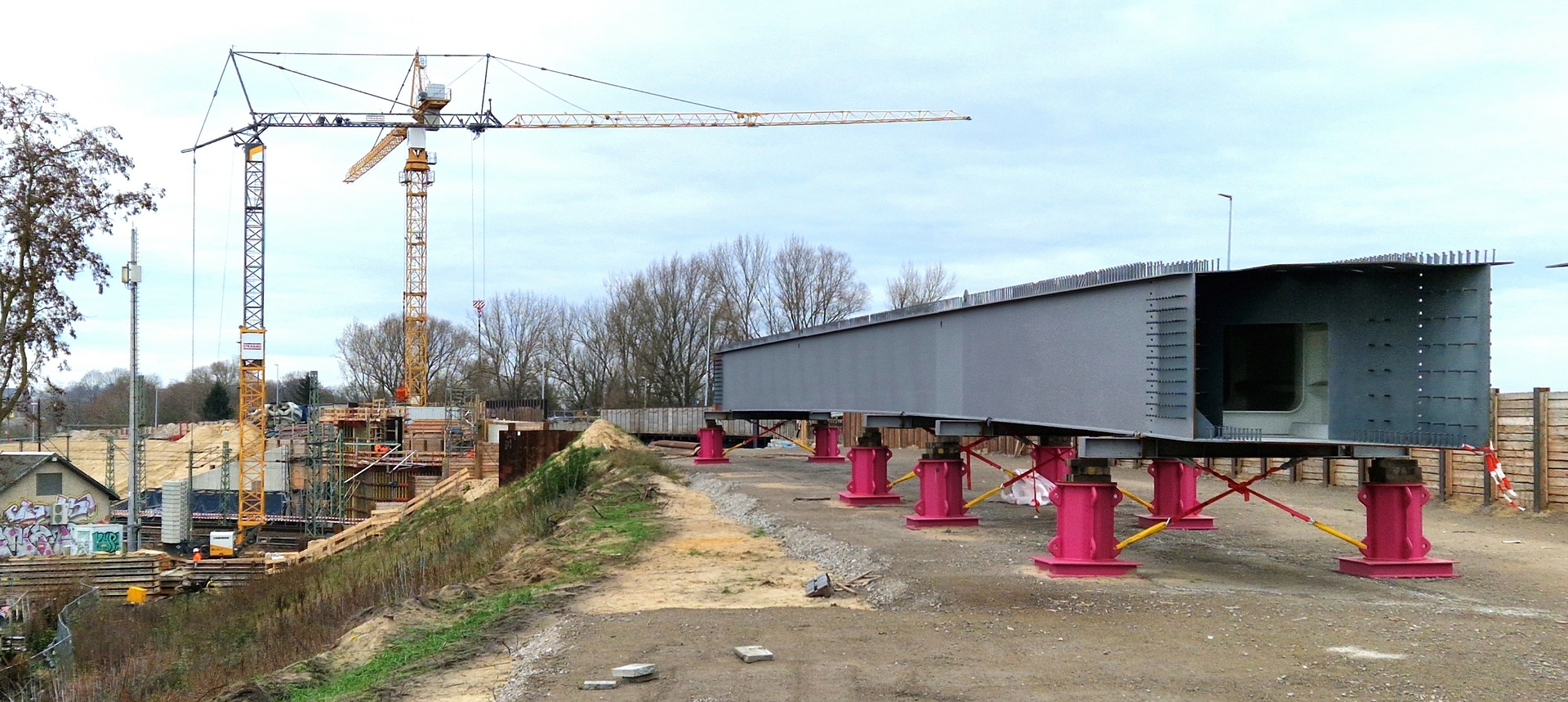 „Im Zuge des Ersatzneubaus der Brücke über die Gleise der Deutschen Bahn AG werden die Stahlträger mit einem Kran auf die Widerlager gehoben. Die Tonnage der Bauteile liegt bei etwa 130 Tonnen pro Stück. Die Kranausladung beträgt etwa 42 Meter und ragt über die derzeit befahrbaren Fahrspuren. Aus Sicherheitsgründen darf sich während des Einhubs nur Fachpersonal innerhalb des Schwenkbereiches befinden.“