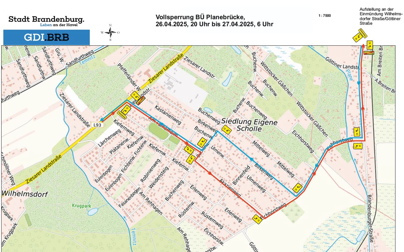 Während der Vollsperrung wird der Verkehr über Göttiner Landstraße, Eichhorstweg, Birkenweg, Buchenweg und Am Turnerheim zur Ziesarer Landstraße umgeleitet. In umgekehrter Richtung von der Ziesarer Landstraße über die Straße Am Turnerheim, Buchenweg, Akazienweg, Eichhorstweg zur Göttiner Landstraße. Auch Fußgänger und Radfahrer können die Baustelle im Bereich des Bahnüberganges während der Vollsperrung nicht passieren.