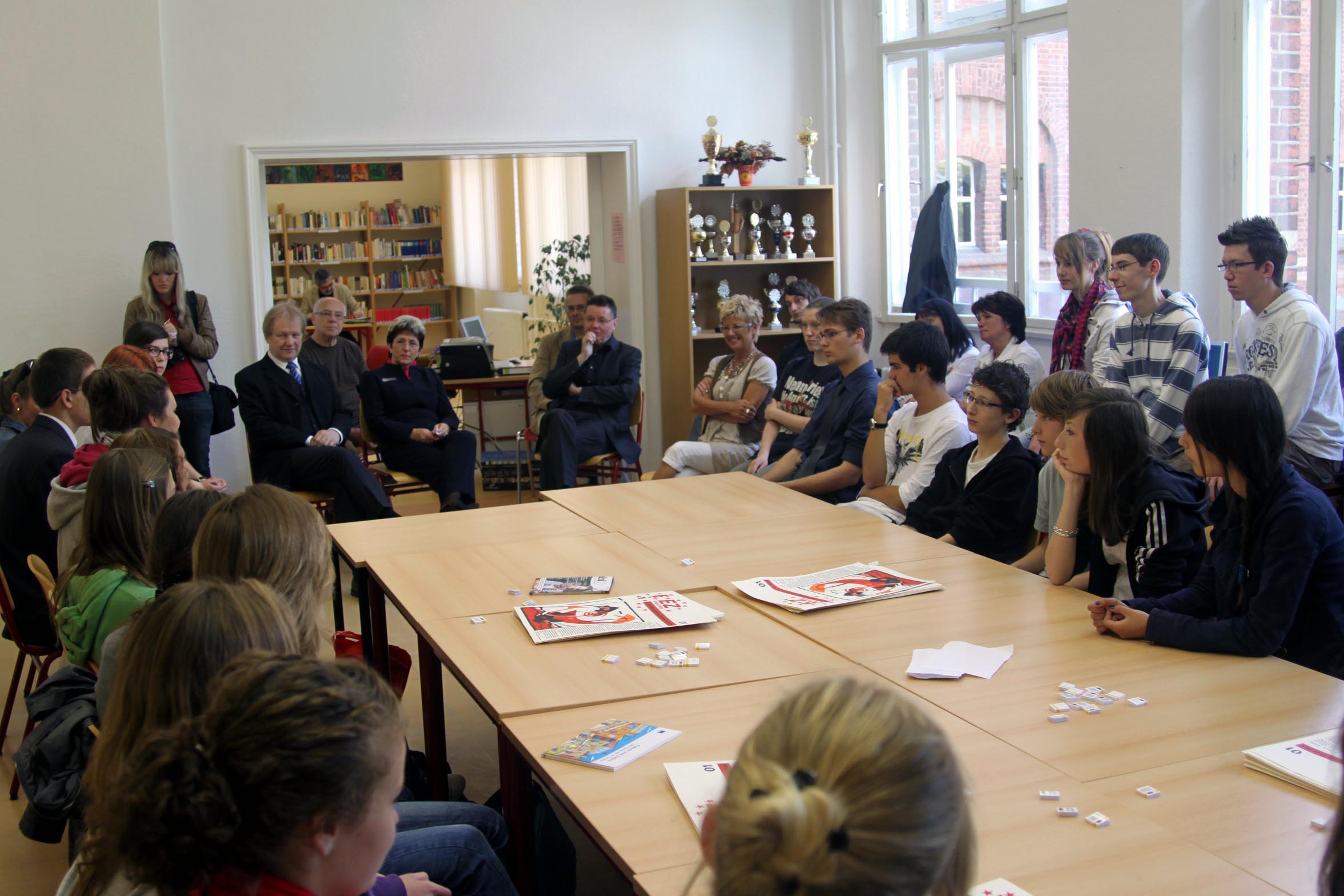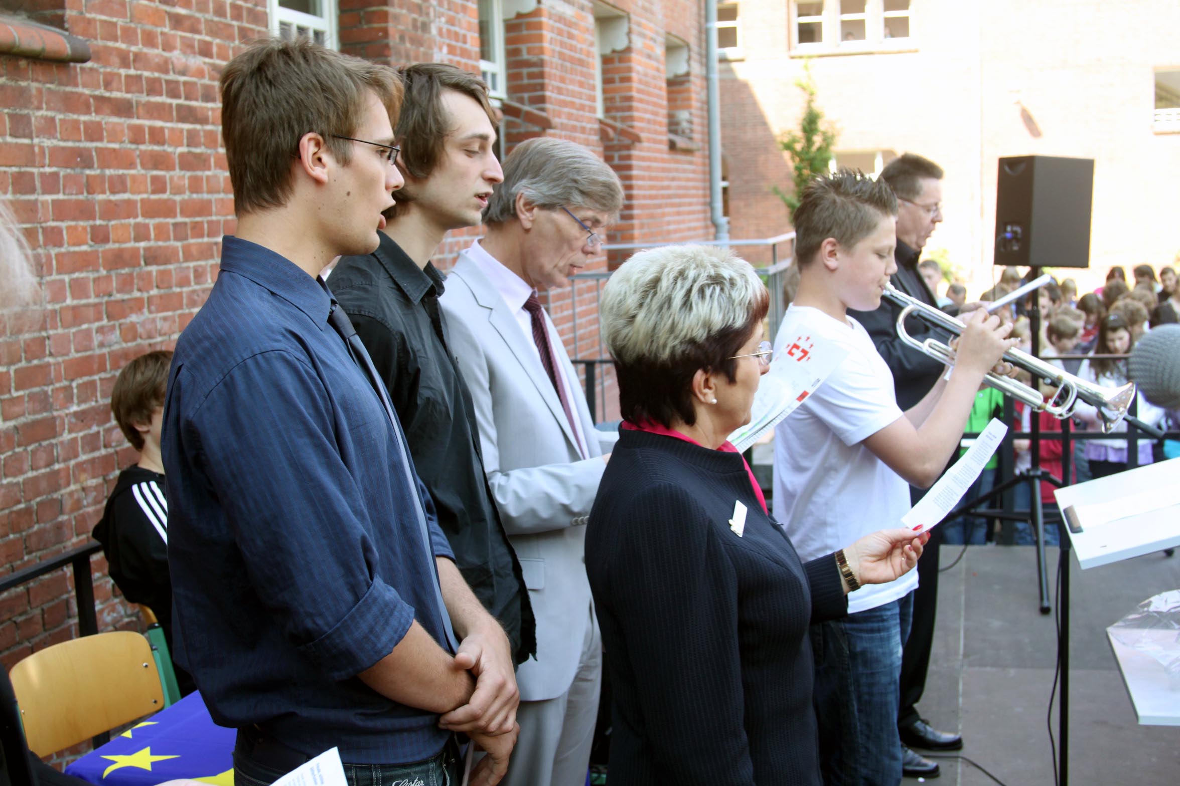 Nach der Übergabe der Urkunde, dem Singen der Europahymne und dem Hissen der Europafahne hatten Austauschschüler in einer lockeren Gesprächsrunde mit der Oberbürgermeistern Dietlind Tiemann die Möglichkeit, ihr eigenes Schulsystem mit dem deutschen Schulsystem zu vergleichen. Die Austauschschüler stammten aus Polen, Frankreich, Ungarn, Kolumbien, Argentinien, Indien und den USA. Die deutlichsten Unterschiede lagen in dem Tragen von Schuluniformen und in der größeren Menge an Pausen zwischen den Unterrichtsstunden in Deutschland.