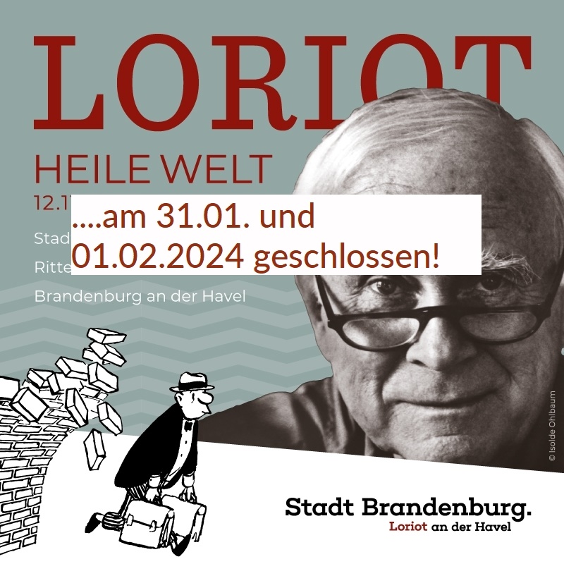 Aufgrund eines Ausfalls der Heizung ist das Stadtmuseum Brandenburg an der Havel im Frey-Haus und somit auch die Sonderausstellung „Loriot – Heile Welt“ am Mittwoch, 31. Januar 2024 und Donnerstag, 1. Februar 2024 geschlossen. Wir hoffen, dass wir Sie, unsere Besucherinnen und Besucher am Freitag, den 2. Februar 2024 zu den Öffnungszeiten von 11:00 – 17:00 Uhr wieder begrüßen können.