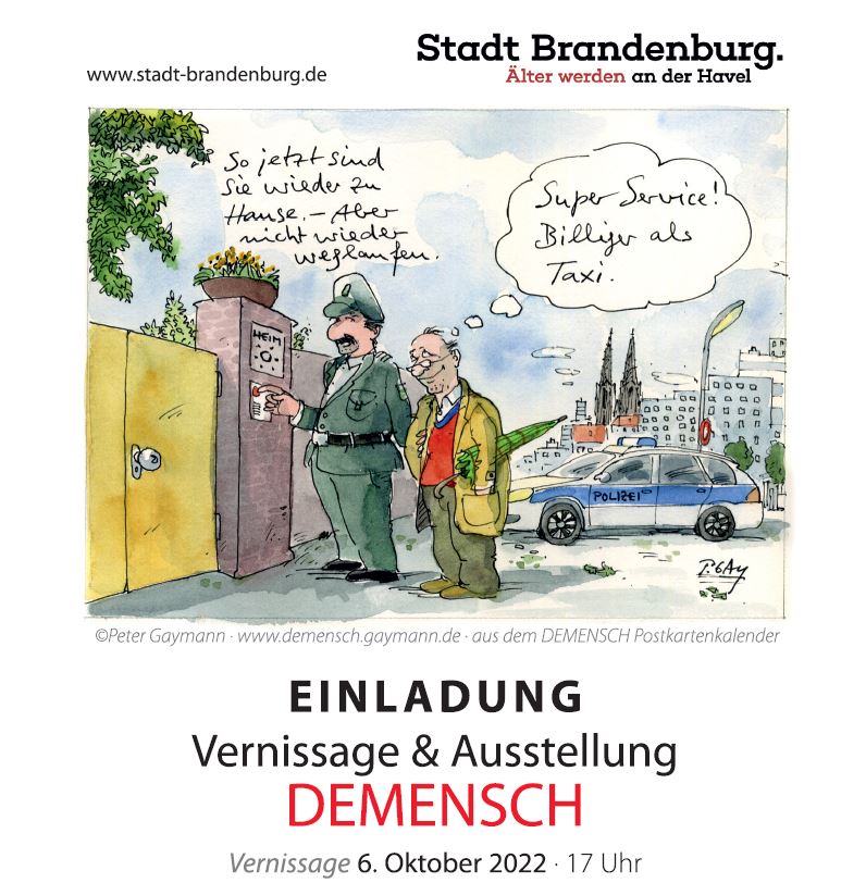 Die Stadt Brandenburg an der Havel lädt gemeinsam mit der Alzheimergesellschaft Brandenburg e. V. Selbsthilfe Demenz und im Beisein von Alexandra Adel, Beigeordnete für Jugend, Soziales und Gesundheit sowie Schule und Sport, am Donnerstag, dem 06.10.2022, um 17:00 Uhr, zur Eröffnung der Wanderausstellung „DEMENSCH – Alltagssituationen von Menschen mit Demenz“ des Cartoonisten Peter Gaymann in das Gotische Haus, Johanneskirchplatz 4, ein.