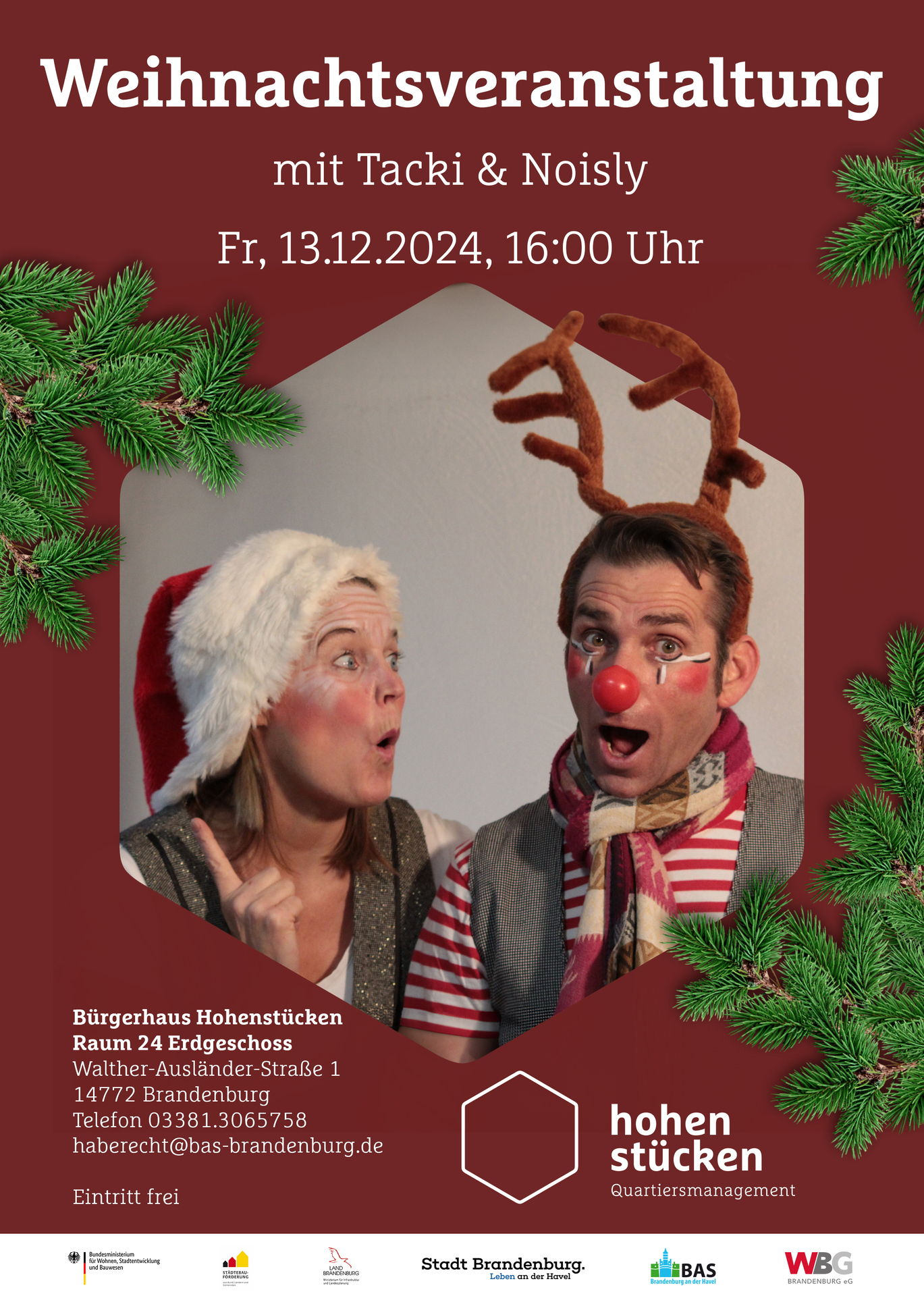 Am Freitag, 13. Dezember 2024, findet im Bürgerhaus Hohenstücken in der Walther-Ausländer-Straße 1 eine Weihnachtsveranstaltung statt. Sie beginnt um 16:00 Uhr im Multifunktionsraum (R 24) im Erdgeschoss und dauert circa 40 Minuten. Gezeigt wird das Programm für Kinder „Weihnachten fällt nicht aus“ mit Tacki und Noisly. Im Anschluss wird der Weihnachtsmann zu Gast sein. Der Eintritt ist frei.