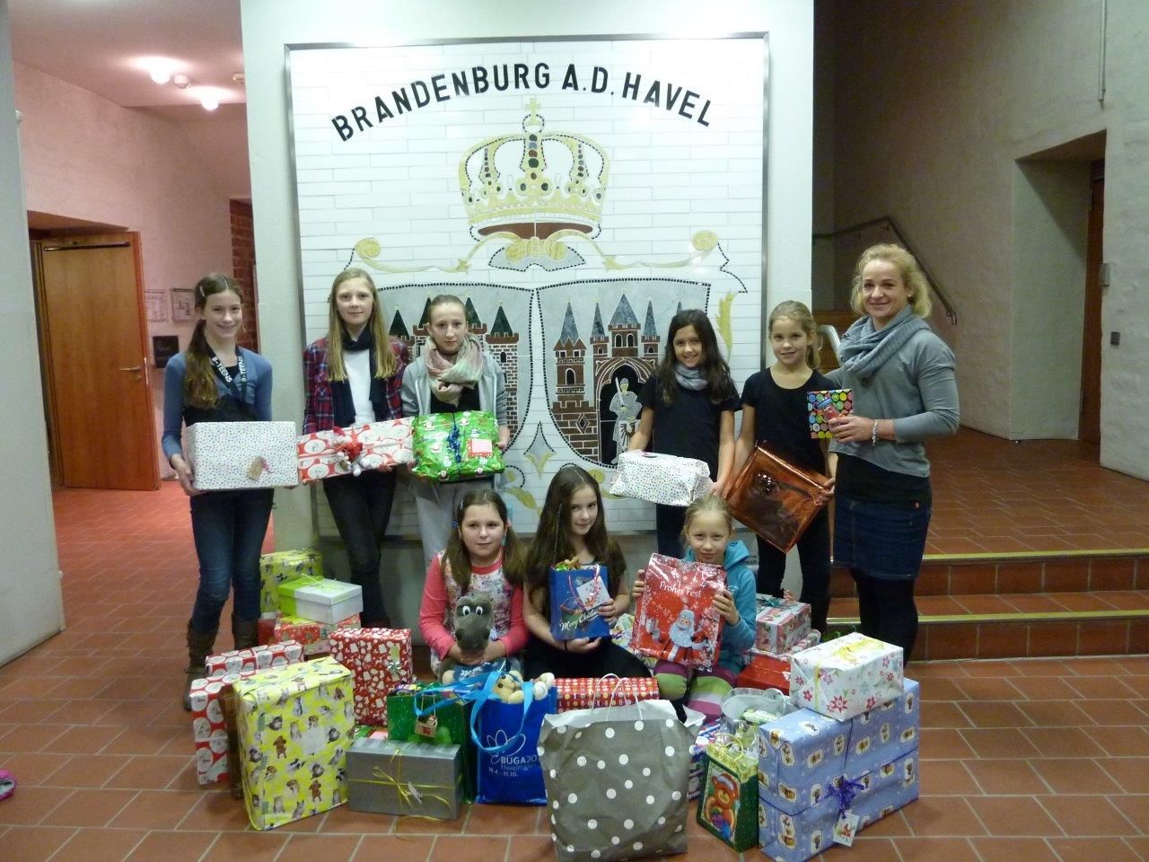 Unter dem Motto „Kinder für Flüchtlingskinder, wir helfen mit einer Päckchenaktion“ übergaben am Mittwoch, dem 16.12.2015, Kinder der Tanzgruppe B-Teens unter der Leitung von Doreen Butryn, mit Unterstützung von den BACARA-Kids, den VHS-Tanzgruppen, der VHS- Zumbagruppe und der VHS-Sportgruppe, Weihnachtspäckchen für Flüchtlingskinder an Kornelia Köppe, Gleichstellungsbeauftragte der Stadt Brandenburg an der Havel.