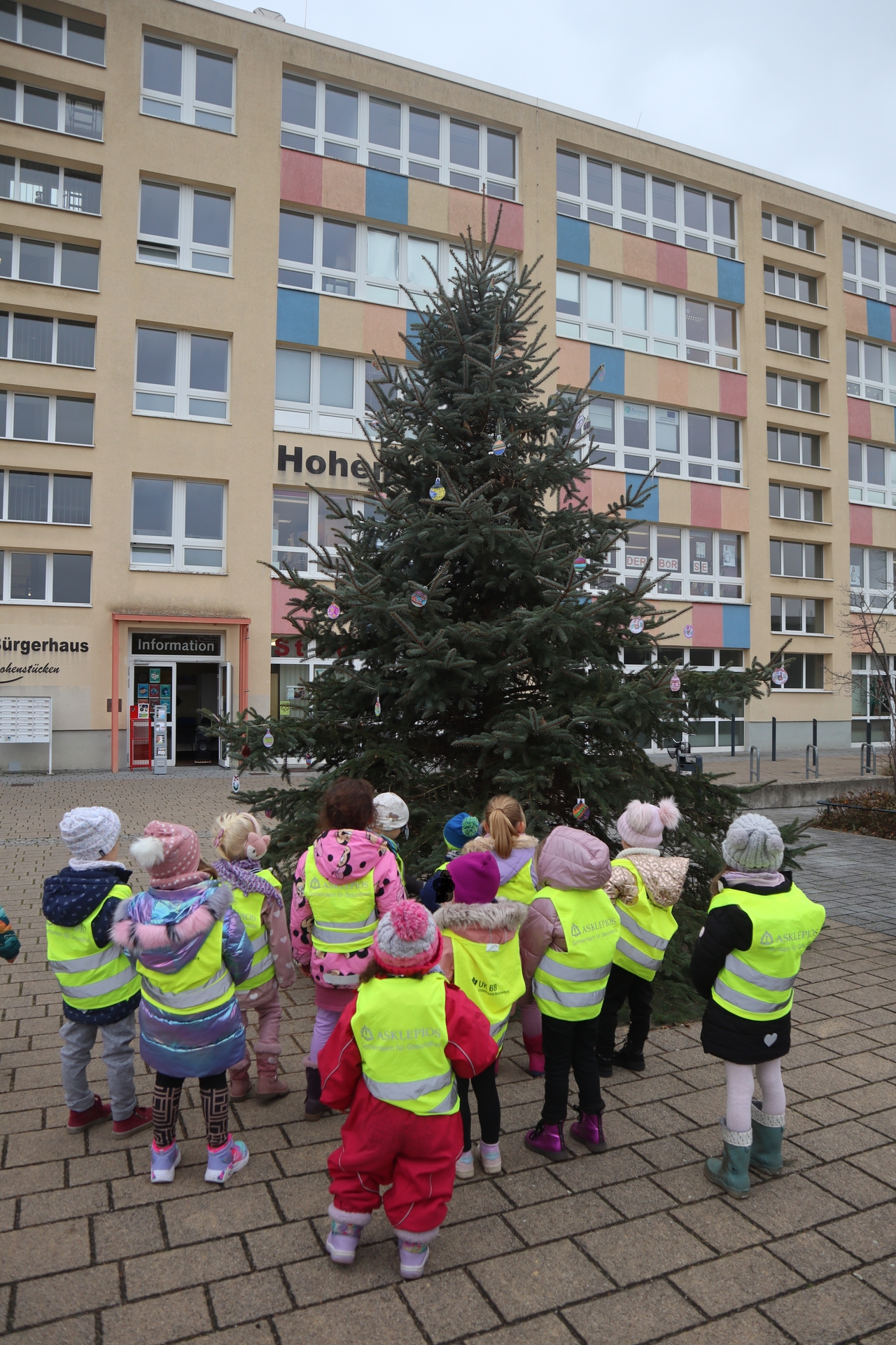 Kinder der am Tschirchdamm ansässigen Kita „Keks & Krümel“ haben den kürzlich von Bauer Lau angelieferten und aufgestellten Weihnachtsbaum – eine 5 Meter hohe Blaufichte – vor dem Bürgerhaus Hohenstücken geschmückt.
