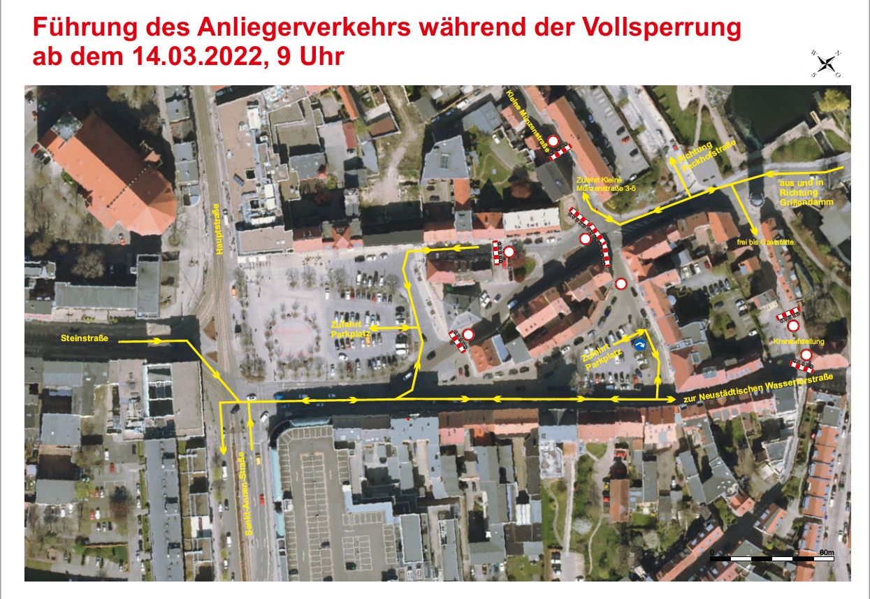 Zusätzlich erfolgt nun die Vollsperrung der Straße Molkenmarkt in Richtung Fußgängerzone und zum großen Parkplatz Neustädtischer Markt. Damit sind sowohl der große Parkplatz und auch der Parkplatz auf dem kleinen Neustädtischen Markt nur noch aus Richtung Steinstraße/Sankt-Annen-Straße erreichbar. Aus Richtung Grillendamm/Klein Kreutz muss dann die ausgeschilderte Umleitung genutzt werden. Ebenfalls nur aus dieser Richtung ist ab diesem Zeitpunkt auch die Neustädtische Wassertorstraße zu erreichen. Rund um den kleinen Neustädtischen Markt besteht ab dem 14.03.2022, 07:00 Uhr absolutes Haltverbot.
