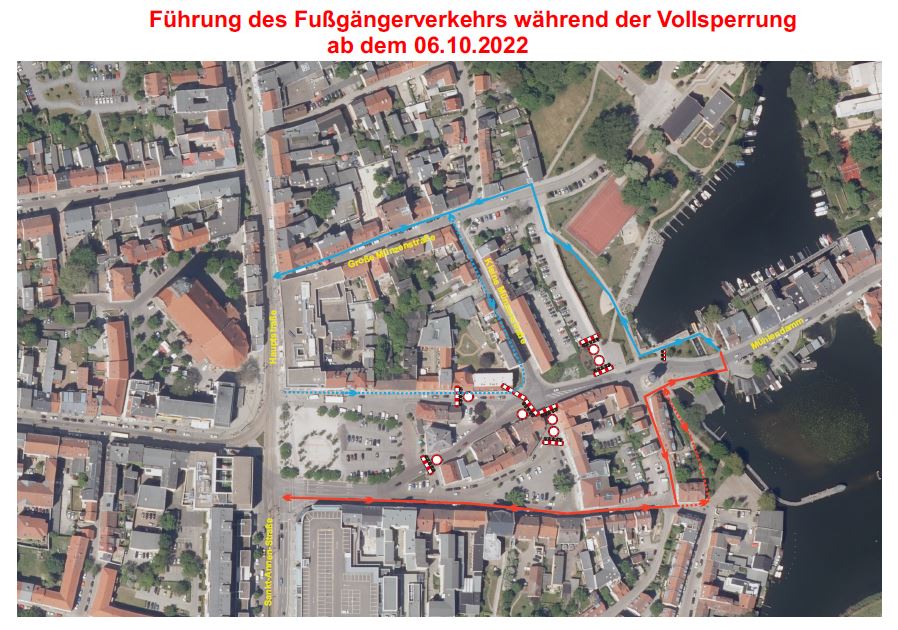 Aber auch für Fußgänger gibt es Änderungen. Für den Einbau eines Schachtbauwerkes muss der Gehweg in Höhe Mühlentorturm gesperrt werden. Fußgänger in Richtung Hauptstraße nutzen dann bitte die Grünanlage an der Näthewinde und die Große Münzenstraße (blaue Route). In Richtung Sankt-Annen-Straße führt dann der Weg über die Neustädtische Fischerstraße bis zur Kreuzung Neustädtische Wassertorstraße/Deutsches Dorf und weiter über den kleinen Neustädtischen Markt (rote Route). Die gestrichelten Routen können alternativ genutzt werden.