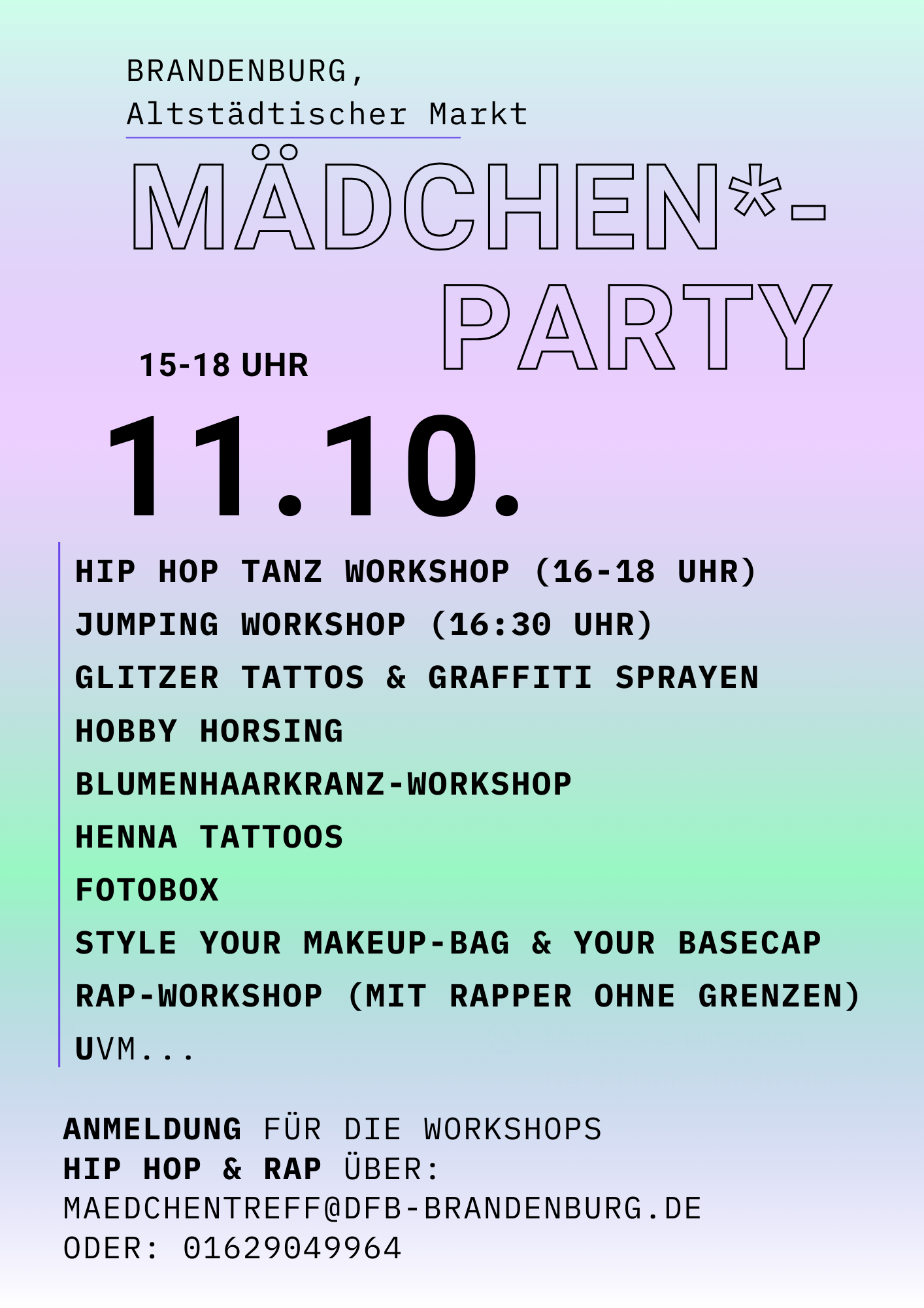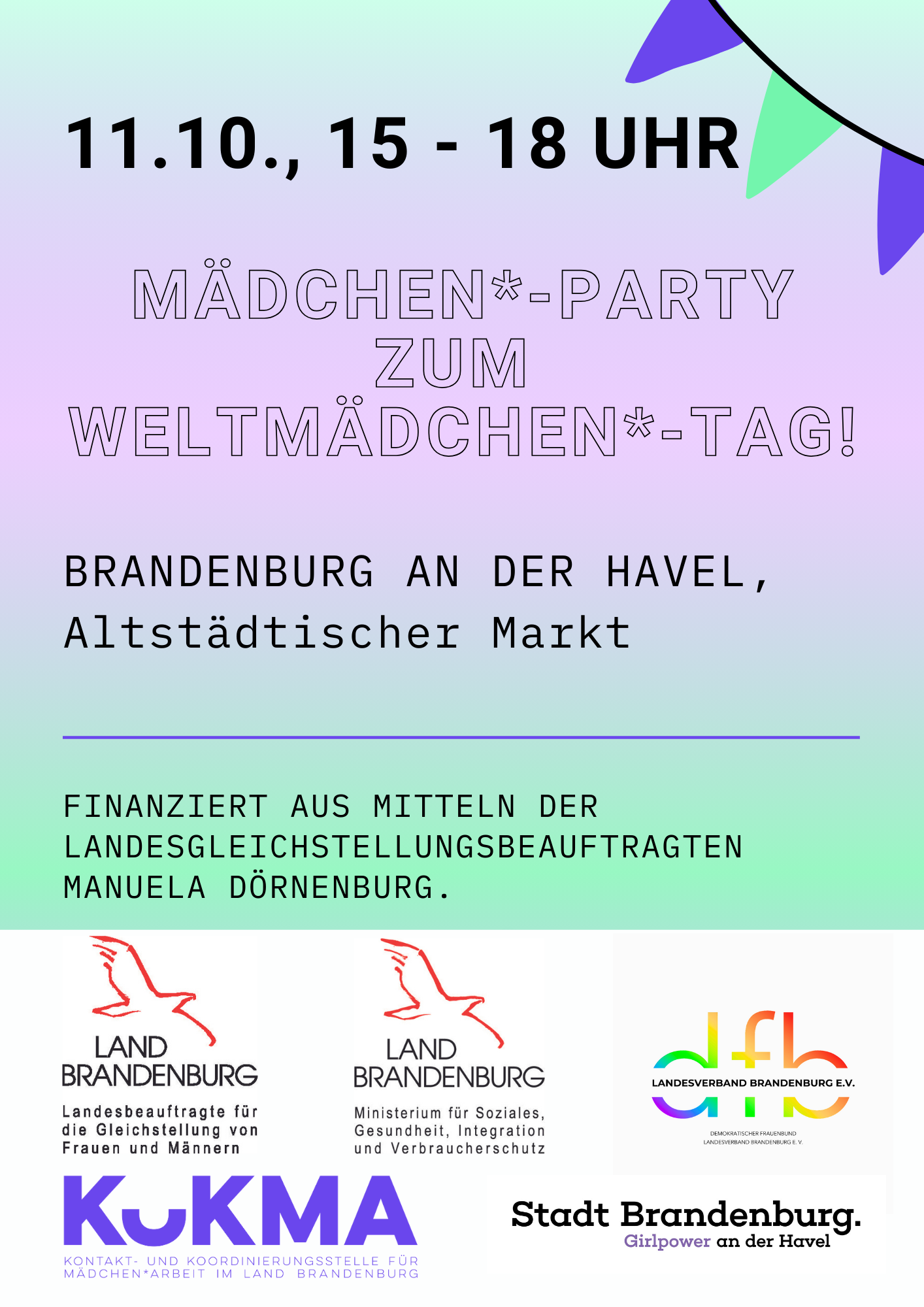 Am Freitag, den 11. Oktober 2024, ist es wieder soweit: Anlässlich des Weltmädchentages wird von „Mädchen*kram“, ein Projekt des Demokratischen Frauenbundes Landesverband Brandenburg e.V., zur Veranstaltung Mädchen*party von 15:00 bis 18:00 Uhr auf dem Altstädtischen Markt eingeladen.