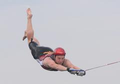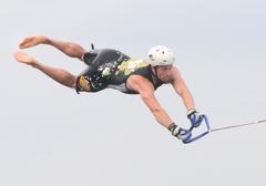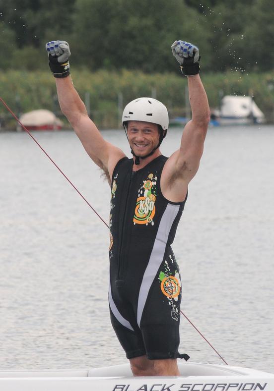 Von der Barfusswasserski-Weltmeisterschaft in Brandenburg an der Havel können am Tag 4 der Wettkämpfe beachtliche Rekorde vermeldet werden. Im JUMP-Semi-Finale der Männer ist David Small (Bilder 1 und 2) aus Großbritannien mit 29,90 m eine neue Weltbestweite gesprungen! Umso beachtlicher ist dieses Ergebnis, weil Minuten zuvor Heinrich Sam aus Südafrika mit 27,80 m die alte Bestmarke von 27,40 m übersprungen hatte, diesen Weltrekord jedoch nur kurz für sich beanspruchen konnte.