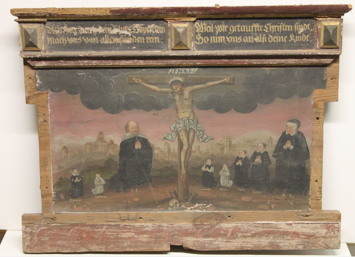 Jetzt kann ein zweites wertvolles Exponat aus dem Museumsfundus restauriert werden und danach präsentiert werden. Dr. Renate Johne, Altphilologin aus Berlin, übernimmt eine Patenschaft für eine Bildtafel (0,70 x 0,55 m), die wohl ursprünglich als Predella eines Epitaphs angefertigt wurde. Bemalt wurde sie wohl im 17. Jahrhundert. Aufstellungsort war die Kirche St. Katharina. Von dort aus wurde das Objekt 1942, wohl kriegsbedingt, in das Museum überführt. Thematisiert ist die Kreuzigung Jesu Christi auf dem Berg Golgatha, der Schädelstätte, bei Jerusalem. Eine Familie – Mutter, Vater und mehrere Kinder – verharren in Anbetung zu Füßen des aufragenden Kreuzes. Es könnte sich dabei um die Darstellung des Stifters und seiner Familie handeln. Ihn kennzeichnen die Initialen „I.L“. Ob es sich dabei um ein Mitglied des Rates der Neustadt oder um einen Pastoren handelt, ist nicht bekannt. Eine Predella schließt für gewöhnlich als Bildtafel einen Altaraufsatz nach unten hin ab. Ein Epitaph – Gedächtnismal – wurde früher zur Erinnerung eines geschätzten Verstorbenen in einer Kirche aufgestellt. Der Auftraggeber – Stifter – ließ sich nicht selten ebenfalls darauf abbilden. Zum Gedächtnis des Verstorbenen wurden Seelenmessen davor abgehalten sowie Andachten durchgeführt.