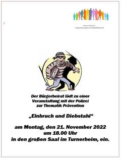 Die Sommerzeit ist zu Ende, es wird früher dunkler und die Gefahr, dass Einbrüche wieder zunehmen, steigt. Aus diesem Anlass lädt der Bürgerbeirat Eigene Scholle/Wilhelmsdorf am Montag, 21. November 2022 um 18:00 Uhr, zu einer Informationsveranstaltung zum Thema „Wie vor Einbruch und Diebstahl schützen?“ mit der Polizei ein.