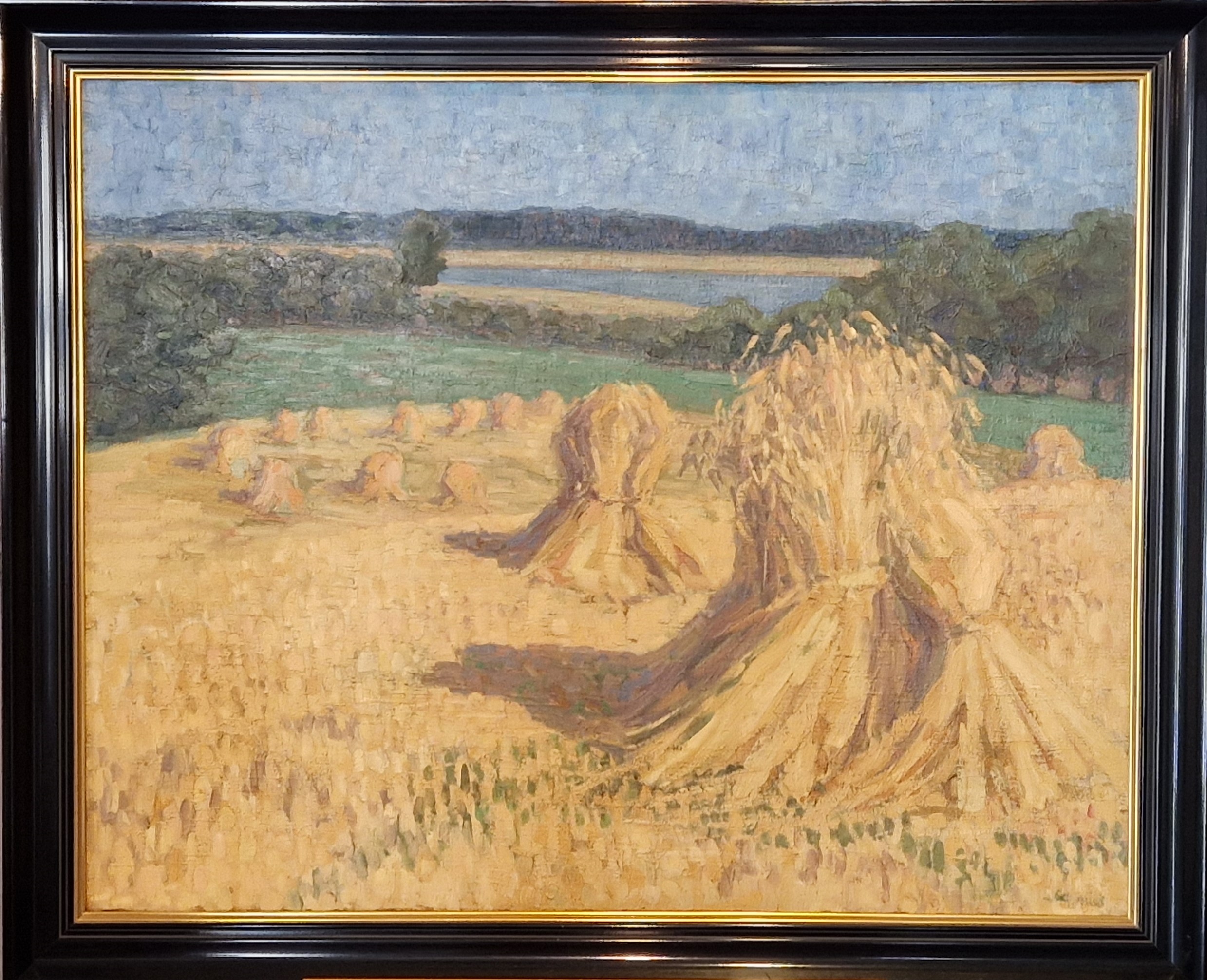 Das großformatige Ölbild mit der Darstellung eines abgeernteten Kornfeldes mit zu Puppen zusammenstellten Garben stammt von der Brandenburger Landschaftsmalerin Luise Schmidt. Sie wurde 1876 in eine Kaufmannsfamilie hinein geboren und erhielt ihre Grundausbildung vermutlich in der Wredow‘schen Zeichenschule. Ihre Motive fand sie auf Reisen zur Ostsee und hier in ihrer Heimatstadt. In den 1920er Jahren wurden diese regelmäßig in lokalen Ausstellungen gezeigt. Luise Schmidt blieb zeitlebens unverheiratet, war Mitglied des Brandenburger Künstlervereins.