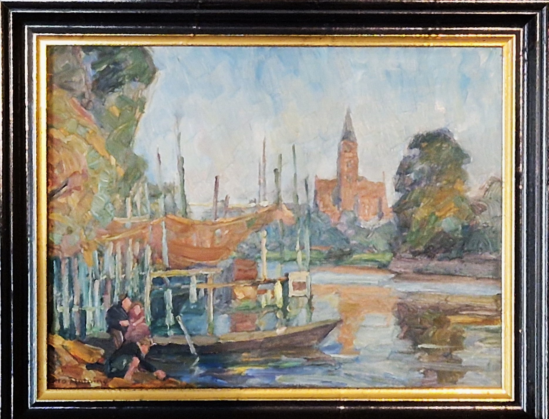 Auch das zweite Gemälde wurde aus privater Hand angekauft und im Nachgang – wie das erstgenannte – durch Grit Jehmlich aus Potsdam fachmännisch restauriert und mit einem neuen, zeitlich passenden Rahmen versehen. Es ist ein Werk von Otto Antoine (1865 – 1951), der als „Maler von Berlin“ seit den 1890er Jahren den rasenden Wandel in Berlin und Umgebung dokumentierte. Seine im Stil des Spätimpressionismus gehaltenen Werke lassen sich beispielsweise in der Stiftung Berliner Stadtmuseum, im Deutschen Historischen Museum oder im Deutschen Technikmuseums finden. Vieles wird aber auch in der Familie des Künstlers und bei privaten Sammlern gehütet. Seine um 1930 entstandene Darstellung des Brandenburger Domes mit Fischern an der Niederhavel im Vordergrund besticht trotz der geringen Größe des Bildes durch seine Details.