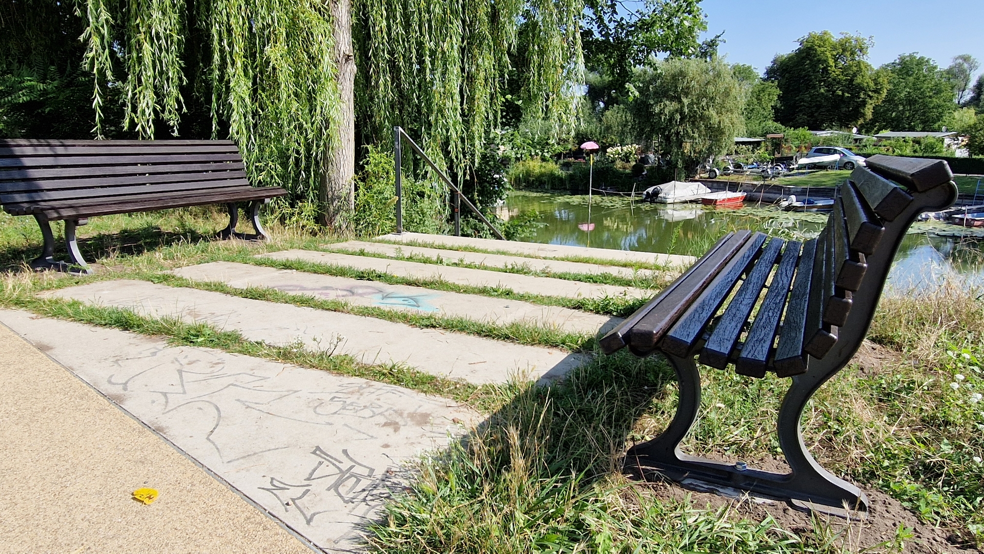 Zwei weitere Bänke haben ebenfalls einen stärker frequentierten Platz gefunden: Ehemals vor dem Sportplatz in der Hammerstraße stehend, ergänzen sie – nach Aufarbeitung und Anstrich – nun am Heinrich-Heine-Ufer sowie im Theaterpark eine bestehende Bank im 90-Grad-Winkel.