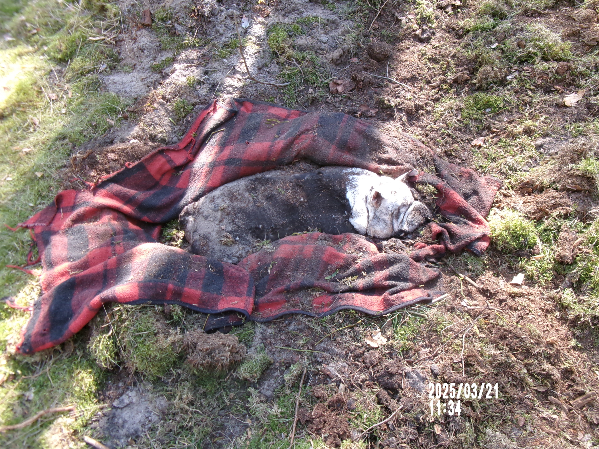 Am 20.03.2025 fanden Spaziergänger im Waldstück zwischen Grüninger Landstraße und Autobahnsee einen toten, weiblichen Hund, bei dem es sich vermutlich um einen Bulldoggenmischling handelt.
