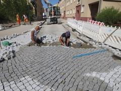 Im Anschluss werden zuerst die Fahrbahn und der nördliche Gehweg gepflastert.