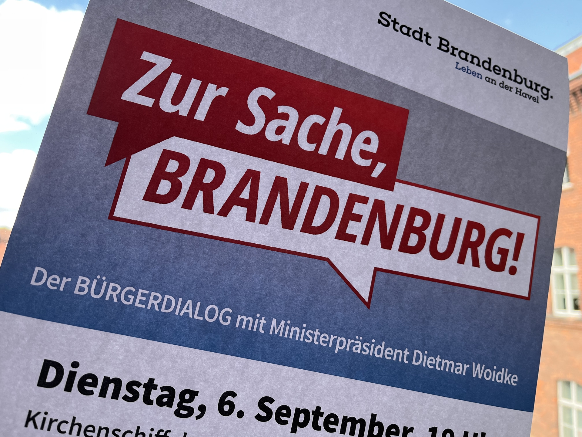 Ministerpräsident Dietmar Woidke setzt am kommenden Dienstag, dem 6. September 2022, seine Reihe von Bürgerdialogen unter dem Titel „Zur Sache, Brandenburg!“ in der kreisfreien Stadt Brandenburg an der Havel fort. Gemeinsam mit Oberbürgermeister Steffen Scheller lädt Woidke alle interessierten Bürgerinnen und Bürger ins St. Paulikloster zu einem themenoffenen Dialog.