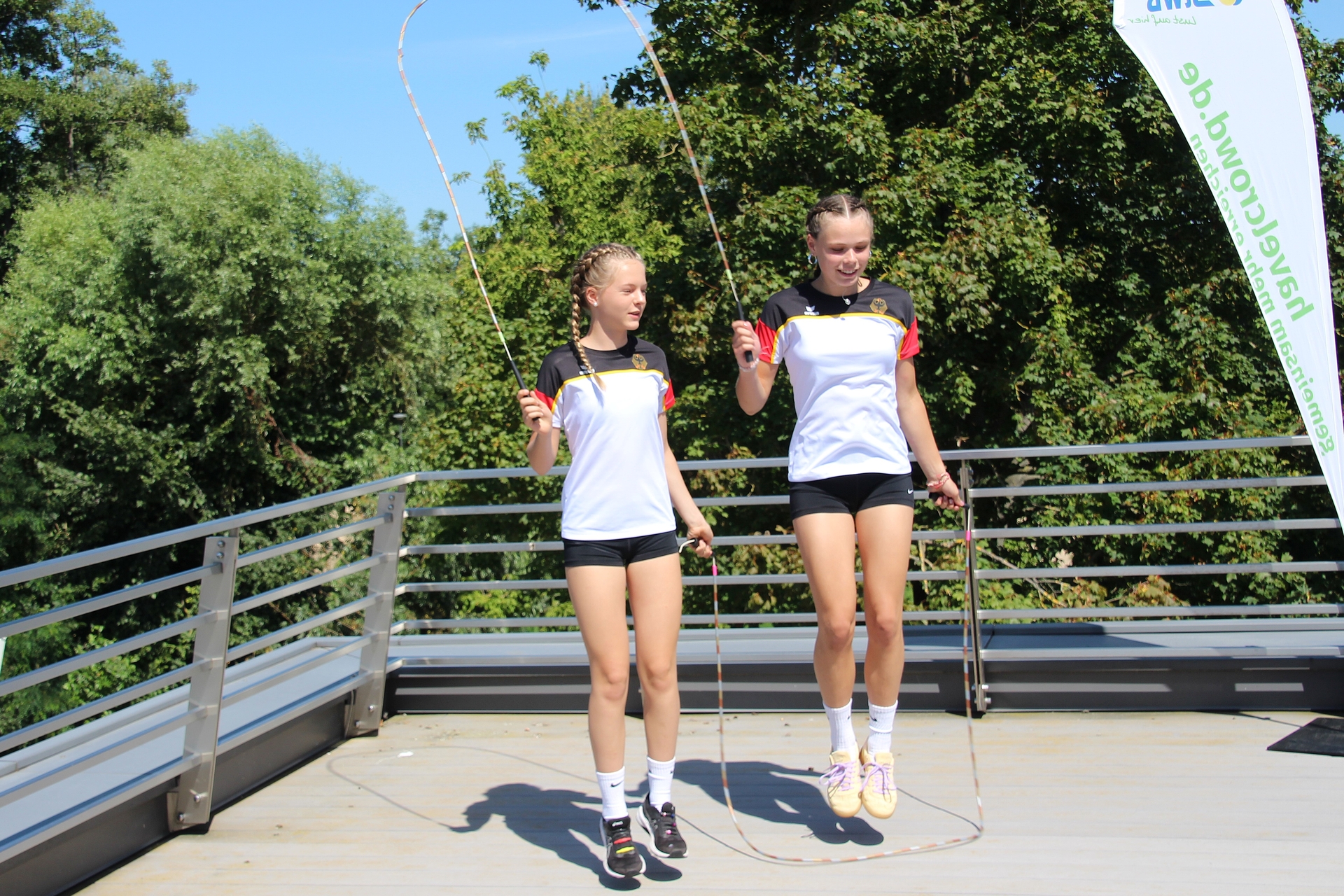 Die Seilspringerinnen Raya Sophie Seidler (13) und Carlotta Pohl (14) vom ASC Brandenburg haben im „Wheel Pair Freestyle“ beim „International Open Tournament“ im japanischen Kawasaki – einem offenen Top-Wettbewerb im Rahmen der Rope-Skipping-Weltmeisterschafts-Woche – den 2. Platz geholt. Dies ist nach dem 5. Platz bei den Junioren-Weltmeisterschaften in Colorado (USA) und einem Bronze-Platz bei den Europameisterschaften in Ungarn erneut ein großer Erfolg für die jungen Brandenburgerinnen. Oberbürgermeister Steffen Scheller sowie die Stadtwerke-Geschäftsführer Michael Woik und Gunter Haase gratulierten den beiden persönlich.
