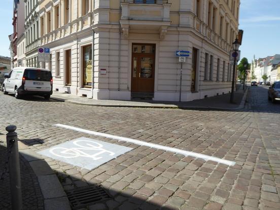 Der Radverkehr, der mit der neuen Verkehrsfreigabe die Hochstraße entgegengesetzt befahren darf, hat an der Einmündung zum Gertrud-Piter-Platz dem von rechts kommenden Verkehr Vorfahrt zu gewähren. Darauf wird der Radfahrer durch die aufgetragene kurze Wartelinie aufmerksam gemacht.