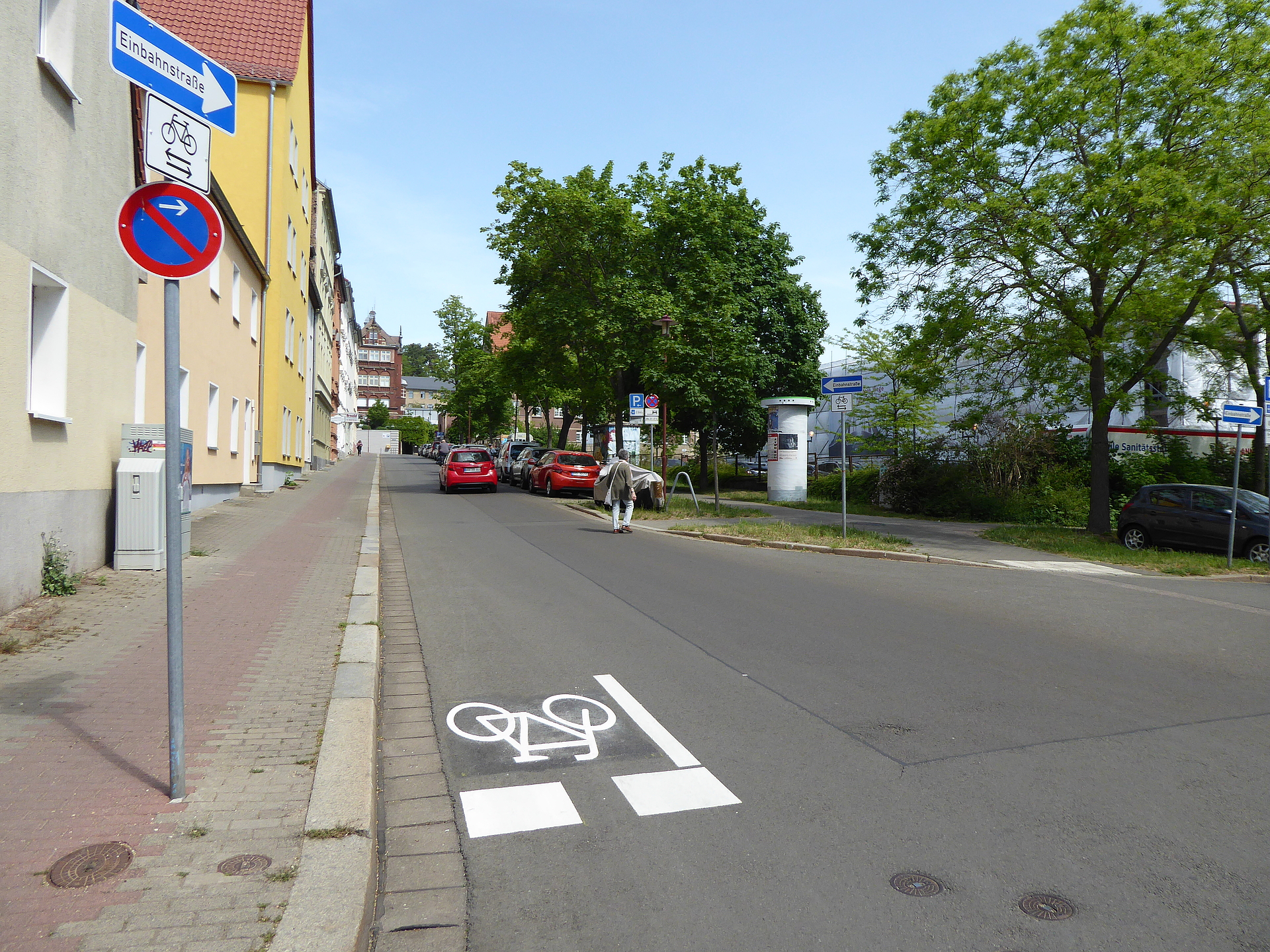 Dem Fahrzeugverkehr wird jeweils am Beginn der Einbahnstraßen durch das angebrachte Zusatzzeichen „Radverkehr in Gegenrichtung“ unter den rechts- und linksstehenden Einbahnstraßenschildern angezeigt, dass Radverkehr in der Gegenrichtung zugelassen ist.