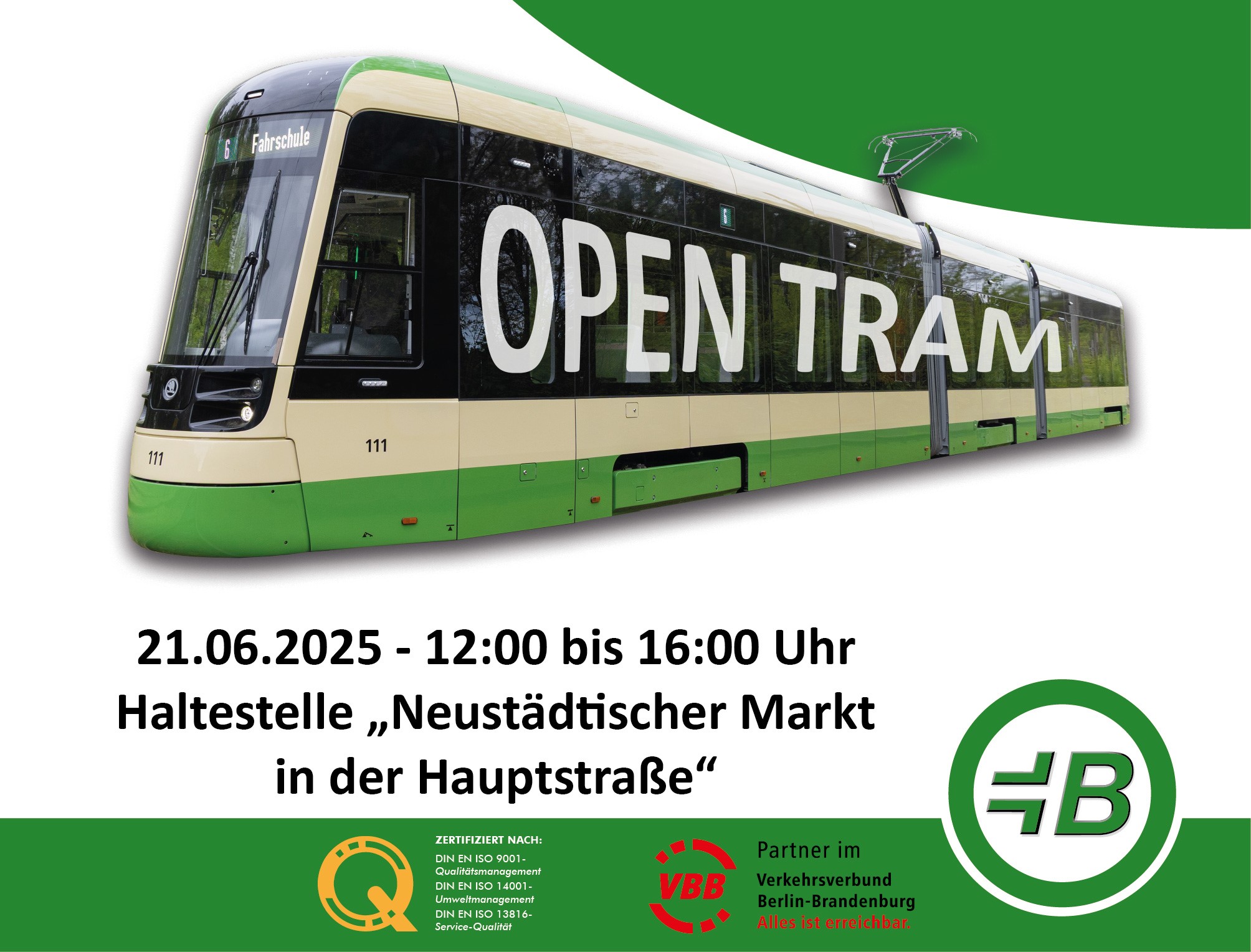 Um die Vorfreude bei der VBBr-Kundschaft zu schüren und allen anderen ebenfalls Lust aufs baldige Mitfahren zu machen, wird am Samstag von 12:00 bis 16:00 Uhr zur „Open Tram“ eingeladen. Oberbürgermeister Steffen Scheller und VBBr-Betriebsleiter Christian Schiller werden um 12:00 Uhr an der Haltestelle „Neustädtischer Markt in der Hauptstraße“ die Türen öffnen und die Bahn zur Besichtigung freigeben.