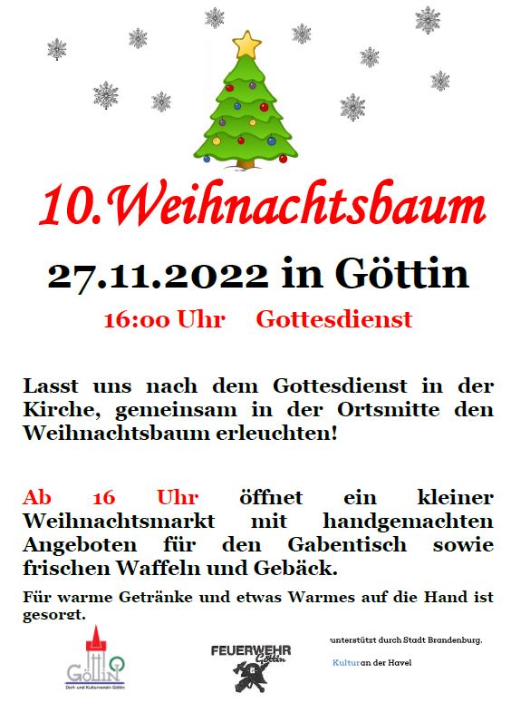 Der Dorf- und Kulturverein Göttin e. V. lädt gemeinsam mit der Freiwilligen Feuerwehr Göttin alle Bewohnerinnen und Bewohner des Ortsteils sowie Gäste am Sonntag, dem 27.11.2022, um 16:00 Uhr, nach dem Gottesdienst in der Kirche, in ihre Ortsmitte ein, um die Lichter am Weihnachtsbaum feierlich zu entzünden.