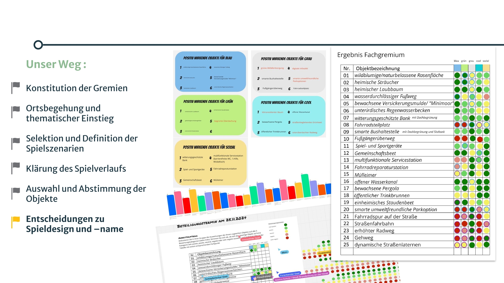 Am 25. November ging es vertiefend im bekannten digitalen Format weiter (Videokonferenz mit Big Blue Button). An diesem Beteiligungstermin stand die Erarbeitung von Spielobjekten im Fokus. Zunächst musste der vergangene Termin abgeschlossen werden und in einer Umfrage legten die Bürgerinnen und Bürger sowie das Fachgremium die Titel und Beschreibung der Szenarien per Umfrage fest. Die Entwicklung von Objekten erfolgte in Kleingruppen. In den digitalen Räumen wurden sechs Favoriten-Objekte je Szenario auf einer digitalen Pinnwand festgehalten. Zum Beispiel standen im Szenario „Stadtgrün“ die Objekte heimischer Laubbaum oder eine Kräuterwiese auf der Wunsch-Liste. Alle 30 Objekte wurden im Anschluss in eine Live-Befragung gerankt, sodass die Top 20 feststand. Im weiteren Schritt des Termin haben die Bürgerinnen und Bürger die Objekte den jeweiligen Szenarien einer Bewertung unterzogen.