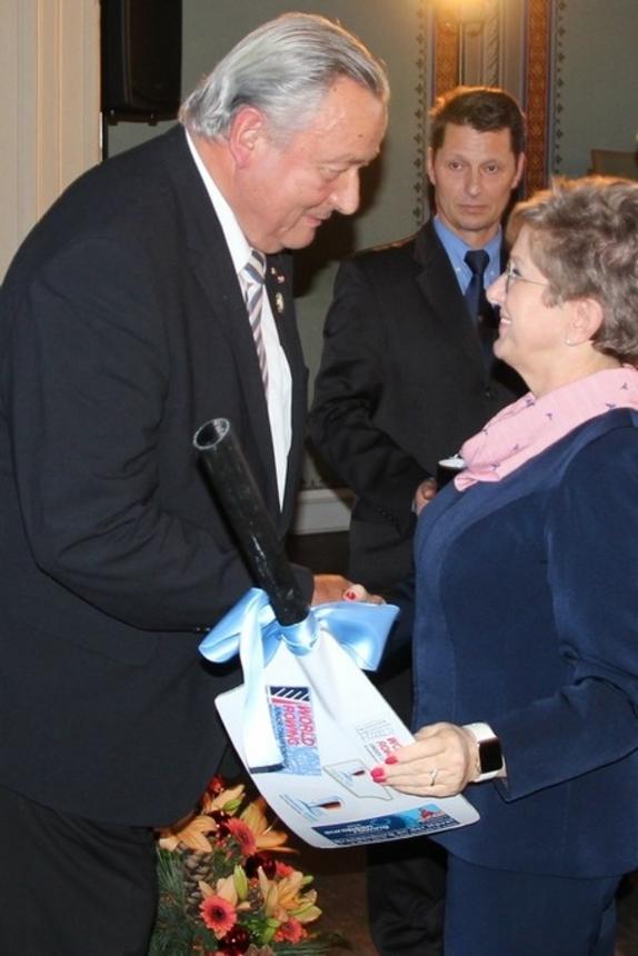 Auch Hartmut Duif, Ehrenpräsident des LRV Brandenburg, ergriff bei der Abschiedsveranstaltung kurz das Wort. Er verwies darauf, dass seit 2005 in jedem Jahr auf dem Beetzsee neben zahlreichen nationalen Regatten immer auch eine internationale Meisterschaft in verschiedenen Wassersportarten stattgefunden hat. Man könne sehr stolz darauf sein, dass die Brandenburger Regattastrecke nach ihrer von Stadt und Land gemeinsam finanzierten Modernisierung und Erweiterung heute zu den weltweiten Top-Adressen für große Titelkämpfe zählt. Zur Erinnerung an die hier ausgetragenen internationalen Ruder-Events und als Dank für ihr beispielgebendes Engagement überreichte er gemeinsam mit dem DRV-Ehrenvorsitzenden der ehemaligen Oberbürgermeisterin ein speziell gestaltetes Ruderblatt.