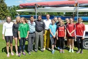 Zum Abschluss seines Besuches traf der Gast aus Indien noch auf junge Kanutinnen, die das Land Brandenburg bei den Ostdeutschen Meisterschaften vertreten werden und die gerade dabei waren, ihren Bootsanhänger auf dem Sattelplatz abzustellen. Zur Erinnerung wurde ein Gruppenfoto mit Nama Ashish, Thomas Konietzko und Uwe Philipp geschossen.