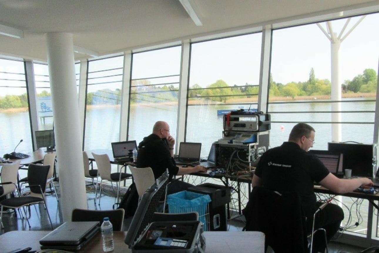 Das Akkreditierungsgebäude ist an das Telekommunikationsnetz der Regattastrecke angebunden.