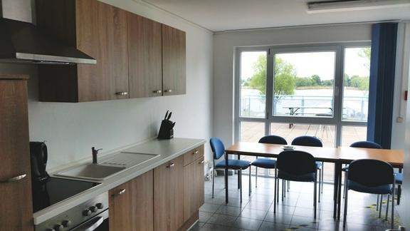 Die Teeküche befindet sich in direkter Nähe zum Beratungsraum und zu den Org.-Büros. Sie ist 23 m² groß und verfügt über einen separaten Lagerraum und eine Durchreiche zur 36 m² großen Cafeteria-Bereich (Aufenthaltsraum), der mit Tischen und Stühlen ausgestattet ist. In der Teeküche sind vorhanden: Kühlschrank, Geschirrspüler, Herd, Mikrowelle, Spüle, Aufbewahrungsschränke, Regalsystem, Geschirr/Besteck etc.