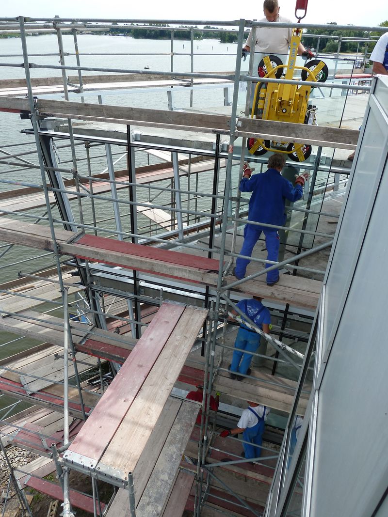 Mit moderner Technik und viel Fingerspitzengefühl setzten Bauarbeiter die mehrere Kilogramm schweren und enorm großen Scheiben passgenau in die vorhandenen Profile des Erweiterungsbaus des Zielrichterturmes ein.