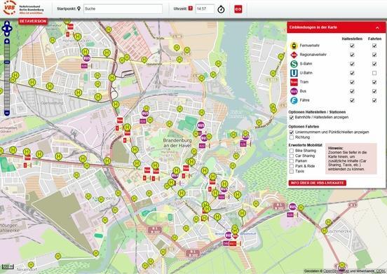 Liniennetz und Fahrplan VBB-Livekarte mit den aktuell fahrenden Bussen und Bahnen in Brandenburg an der Havel (Aktivieren Sie dazu am rechten Rand der Karte die Kategorien „Bus“ und „Tram“)