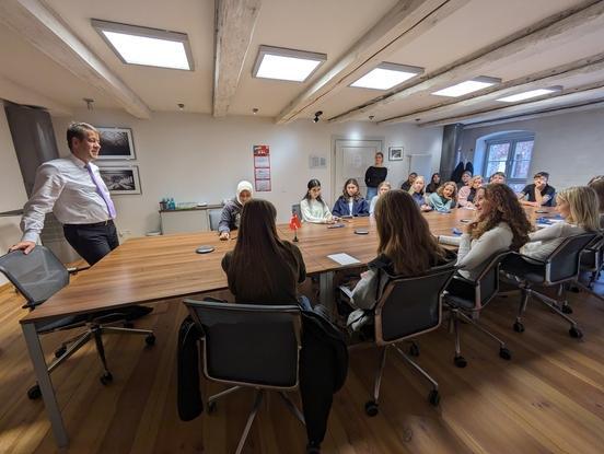 Am 11.10.2023 begrüßte Oberbürgermeister Steffen Scheller 21 Schülerinnen und Schüler des gemeinsamen Partnerschaftsprojektes „Masterclass“ in seinem Büro im altstädtische Rathaus.