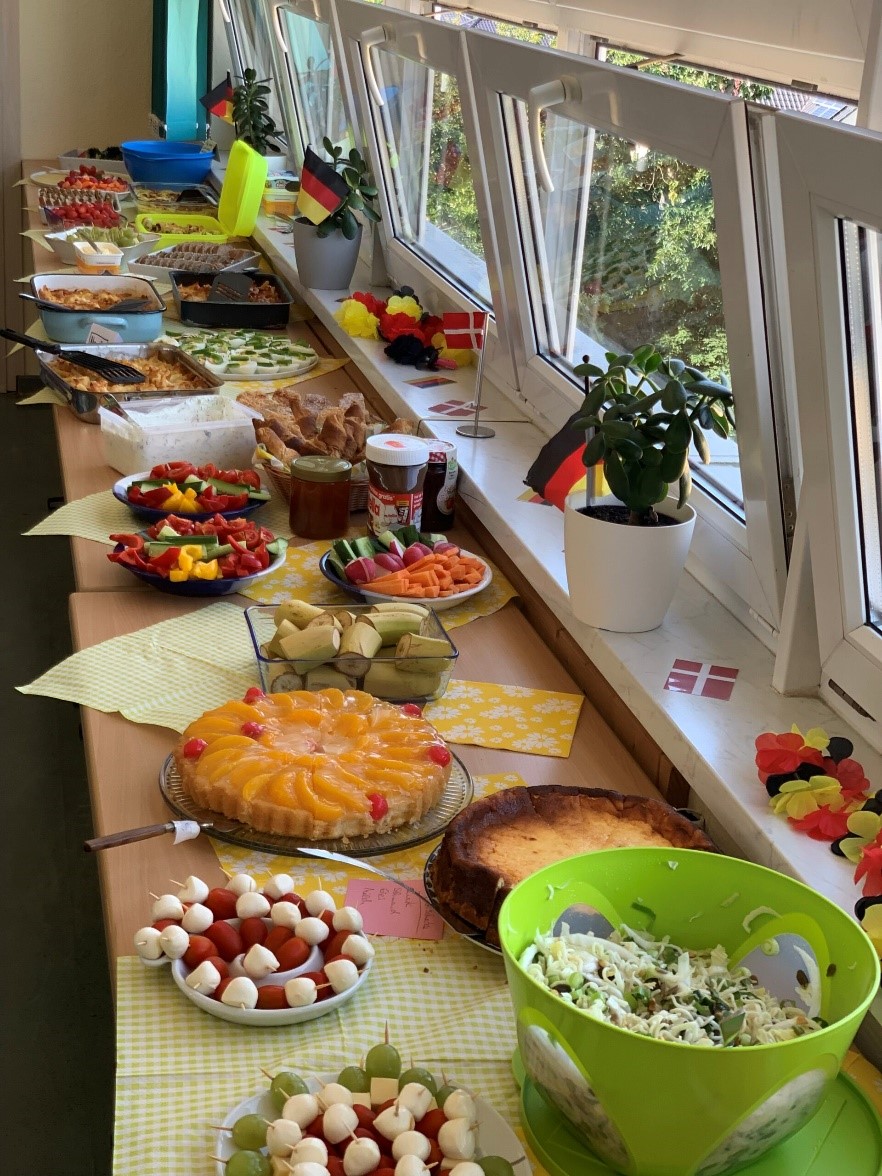 Ein großes leckeres Buffet haben die 7ten Klassen für ihre internationalen Mitschüler geschaffen. Nach einer kurzen Vorstellungsrunde wurden die Schülerinnen und Schüler in Gruppen unterteilt und durch ein buntes Programm geführt. Neben Sport bei bestem Wetter gab es ein internationales Quiz über Brandenburg an der Havel und Ballerup. Ein von Schülern kreierter Rundgang durch die verschiedenen Fachräume innerhalb des Schulgebäudes rundete das Programm ab. Frau Andrea Wissinger, Schulleiterin der Otto-Tschirch-Oberschule zieht ein positives Resumée:
