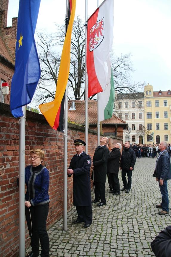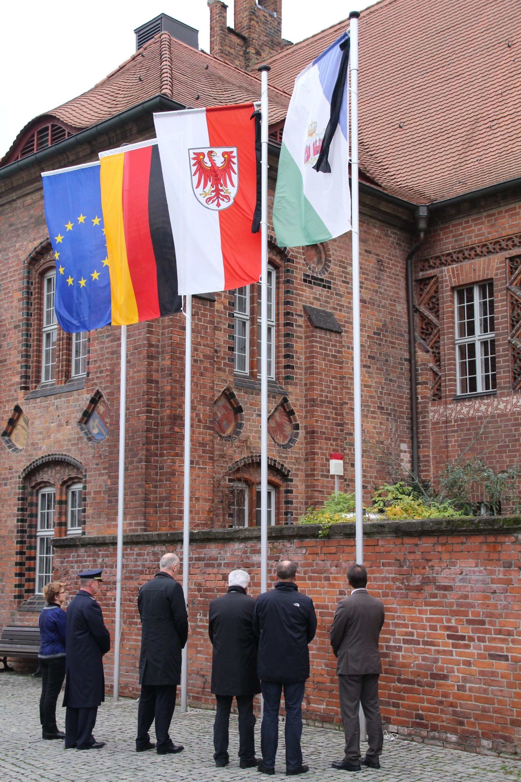 Ministerpräsident Dr. Dietmar Woidke hat am 16.11.2015 zusammen mit Bürgermeister Steffen Scheller und vielen Brandenburgerinnen und Brandenburgern um 12:00 Uhr am Altstädtischen Rathaus in Brandenburg an der Havel eine Schweigeminute für die Opfer der Terroranschläge von Paris eingelegt und das Hissen der Trauerbeflaggung vorgenommen.