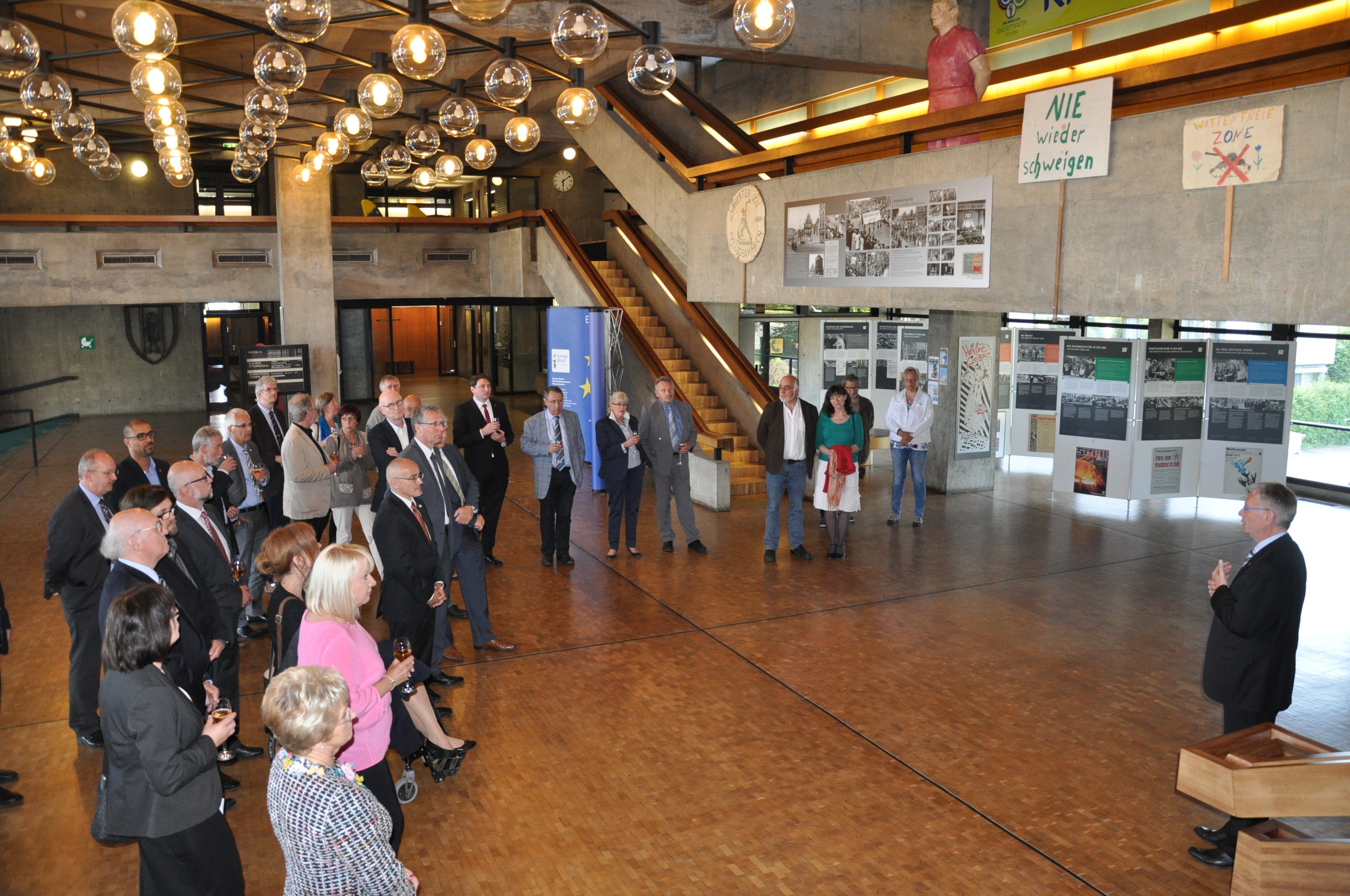 Den Höhepunkt des Besuches stellte die Eröffnung der Ausstellung „Jugend in der DDR“ des städtischen Museums Brandenburg an der Havel im Rathaus in Kaiserslautern dar. Dazu war extra eine kleine Delegation um die Museumspädagogin Gudrun Bauer sowie den ehemaligen Projektschüler Benjamin Jähn in die Partnerstadt gereist. Die anwesenden Gäste zeigten sich beeindruckt vom Ergebnis der Forschungsarbeit der jungen Brandenburgerinnen und Brandenburger. In den kommenden Wochen befassen sich Schülerinnen und Schüler aus Kaiserslautern im Rahmen ihres Unterrichts mit dem Thema des Projektes. Beim anschließenden Empfang zum 25-jährigen Partnerschaftsjubiläum ging Kaiserslauterns Oberbürgermeister Dr. Klaus Weichel auf die Entwicklung der Zusammenarbeit in den vergangenen Jahren und aktuelle Entwicklungen ein. Mit Oberbürgermeisterin Dr. Dietlind Tiemann stimmte er darin überein, dass selbstverständlich an der Partnerschaft festgehalten wird, jedoch die Themen neu gesetzt werden müssen. „Die kommunale Zusammenarbeit und das Lernen voneinander müssen wir zukünftig mehr in den Fokus rücken und gemeinsam nach Lösungen für Probleme suchen, die unsere beiden Städte gleichermaßen betreffen“ sagte das Brandenburger Stadtoberhaupt in diesem Zusammenhang unter anderem.