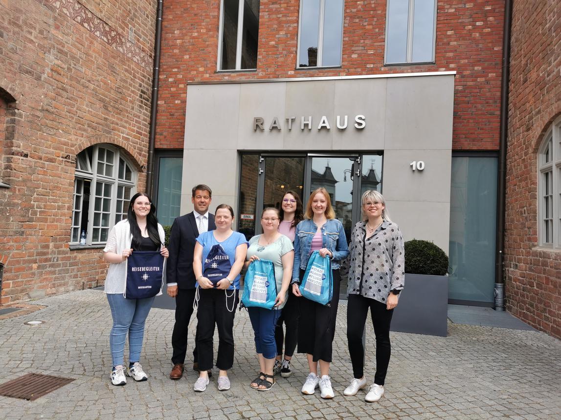 Am ersten Tag wurden die Beiden von Frau Krahnke sowie den Auszubildenden des dritten Lehrjahrs Jennifer Rudolph, Julia Herzberg und Antonia Kettel mit einem kleinem Frühstück in der Abteilung für Personalentwicklung begrüßt. Nach der gemütlichen Runde bei der man sich über die verschiedenen Ausbildungsabläufe und die Arbeit in den jeweiligen Stadtverwaltungen austauschte, spazierte die Gruppe zum Altstädtischen Rathaus und wurde im Büro des Oberbürgermeisters von Frau Andersen und Oberbürgermeister Steffen Scheller empfangen. Mit kleinen Gastschenken überraschten die Kaiserslauterner ihre Gastgeber und bekamen selbst Erinnerungen an ihren Aufenthalt in Brandenburg an der Havel geschenkt. Gemeinsam mit Herrn Scheller tauschten sich die Azubis über ihre Zukunftspläne und weiteren Werdegang innerhalb ihrer Stadtverwaltungen aus.