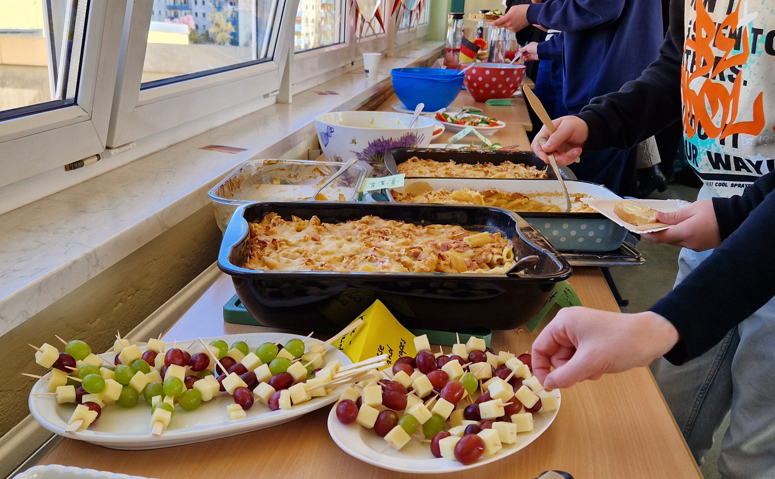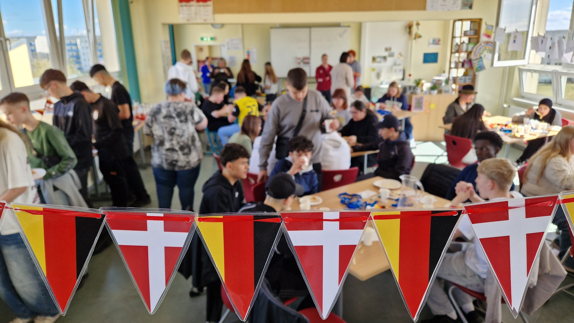 verkündete die Schulleiterin mit Stolz. Es biete sich nicht oft die Möglichkeit für die Schülerinnen und Schüler, ihr im Unterricht gelerntes Fremdsprachenwissen auch in solch praktischen Situationen anzuwenden. Auch ein deutsch-dänisches Quiz hatten sich die Schüler ausgedacht und traten in gemischten Teams an, wie bei gemeinsamen Sportspielen. Das anschließende Mitbring-Buffet der Lehrkräfte hatten die Achtklässler vor Ort noch weiter bereichert – mit Gemüsesticks, Suppen und Aufläufen.