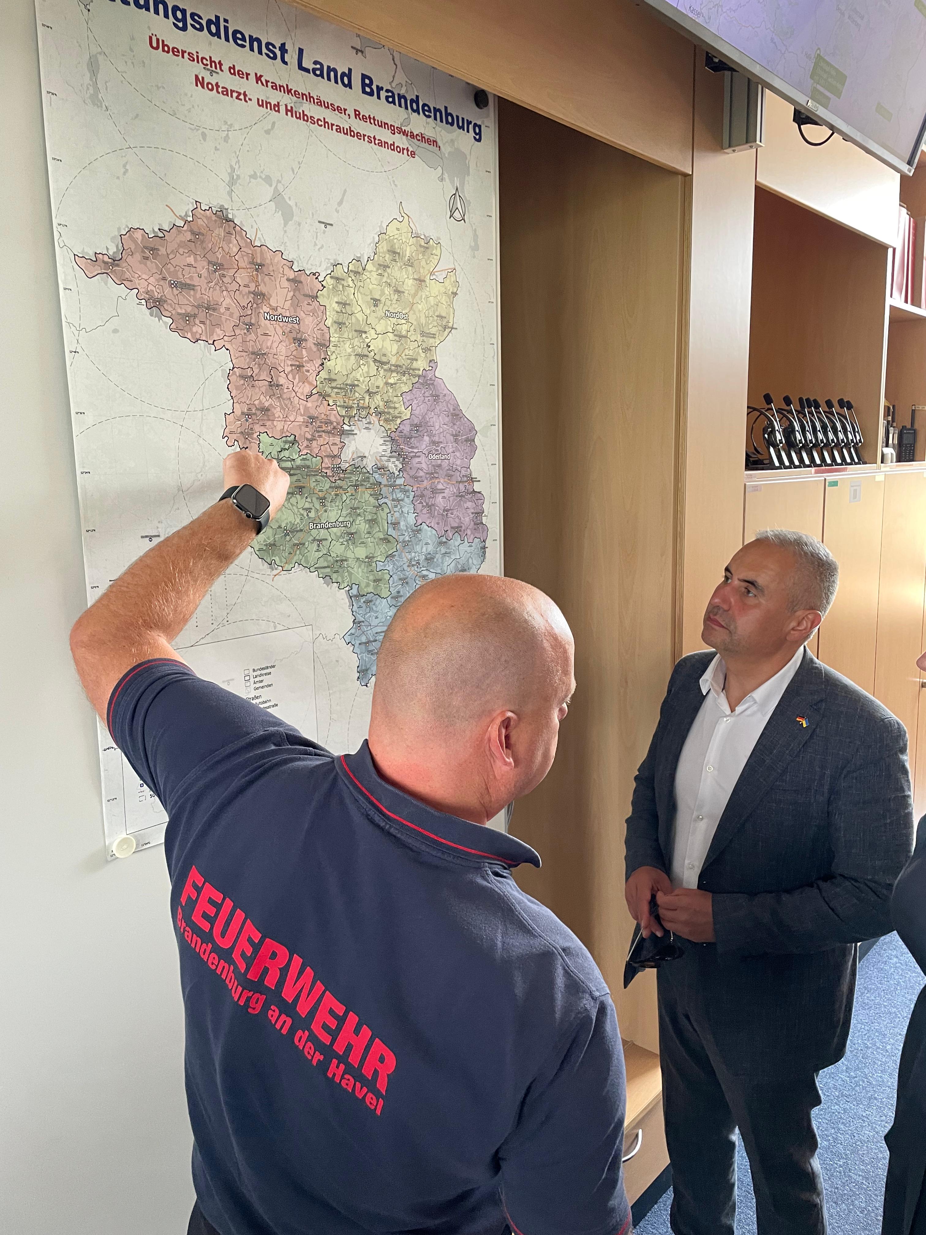 Die Delegation traf sich dann in der Feuer- und Rettungswache der Stadt mit Oberbürgermeister Steffen Scheller und dem Beigeordneten Thomas Barz. Nach einer Führung durch die Leitstelle und der Erläuterung der Arbeit tauschten sich beide Seiten über die Situation in der Ukraine und insbesondere in der Stadt Samar aus. Da die Frontlinie nur rund 100 km entfernt ist, sind die Folgen des Krieges immer noch gravierend. Durch Drohnenangriffe kommt es zu Störungen der Energieversorgung und es gibt eine hohe Zahl von Geflüchteten, die aus Kriegsregionen in die Stadt gekommen sind.