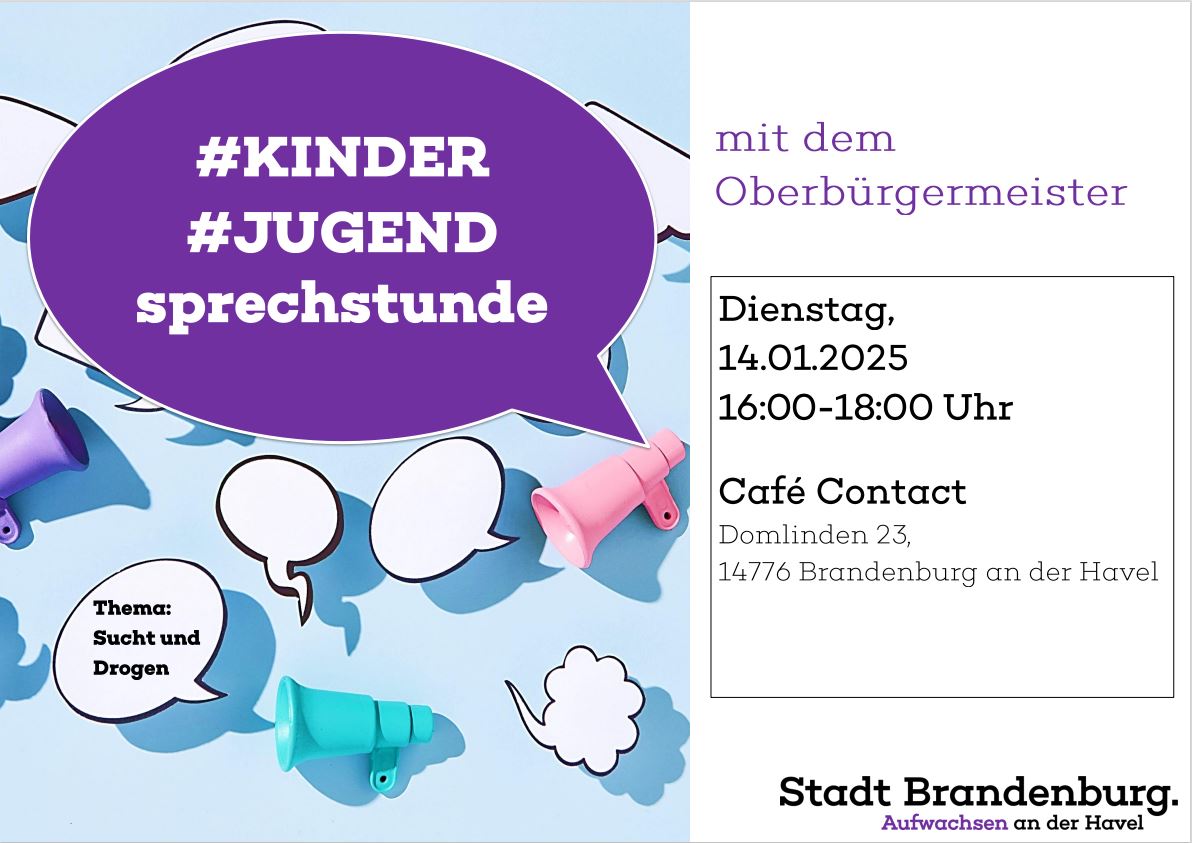 Für ein Kennenlernen oder Wiedersehen bietet sich die nächste Kinder- und Jugendsprechstunde an, für die sich der Oberbürgermeister wie gewohnt zwei Stunden Zeit nimmt. Sie beginnt um 16:00 Uhr, bietet Raum für viele Gespräche und ist schwerpunktmäßig dem Thema „Sucht und Drogen“ gewidmet. Fachleute von der Kontakt- und Drogenberatungsstelle für junge Leute SOMATRiX sowie vom Sachbereich Prävention der Polizeiinspektion Brandenburg an der Havel werden vor Ort sein.