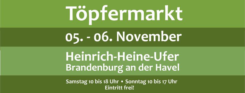 hell- und dunkelgrün gestreifte Anzeige mit dem Text: Töpfermarkt 05.-6. November, Heinrich-Heine-Ufer Brandenburg an der Havel, Samstag 10 bis 18 Uhr