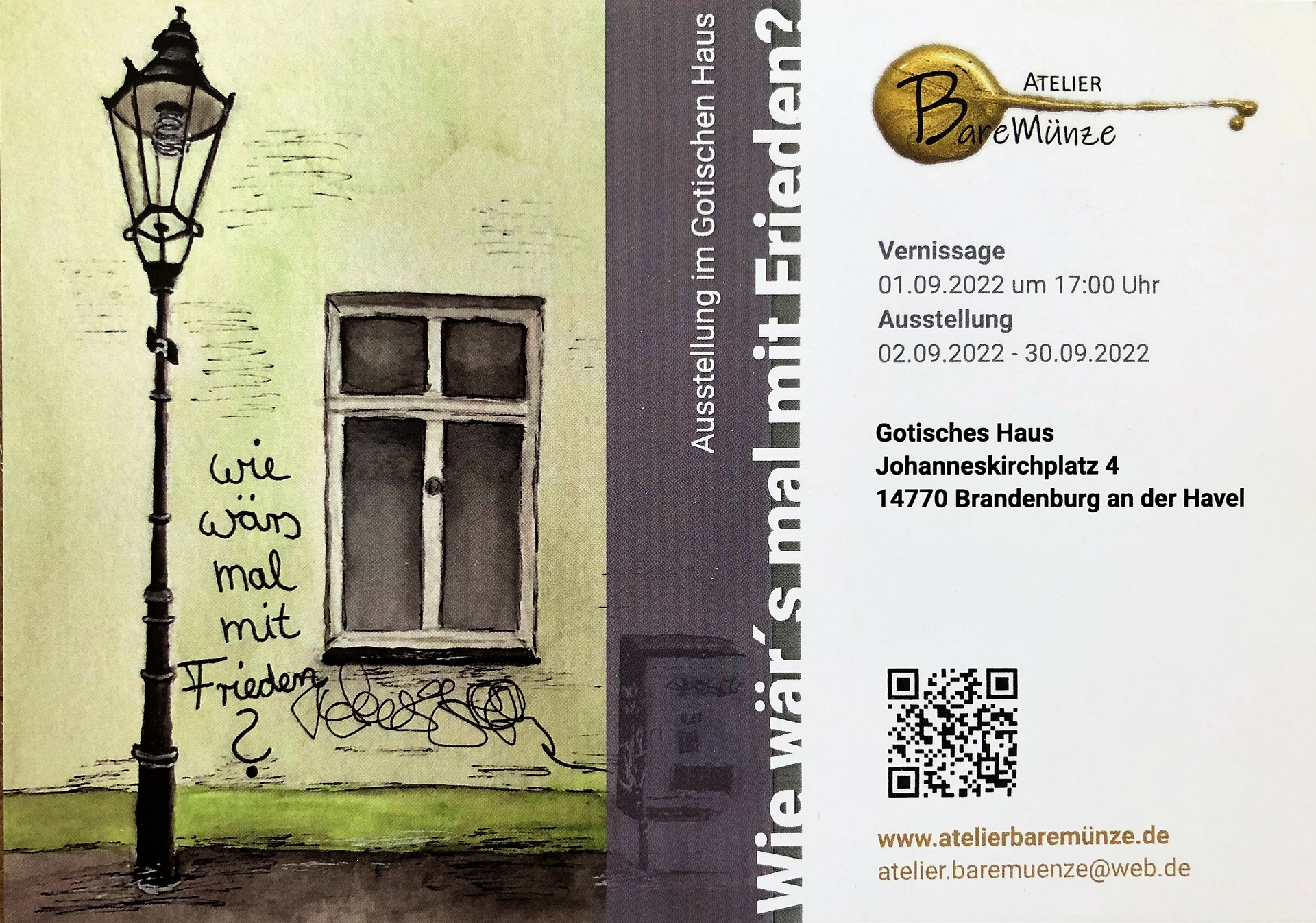 Am Donnerstag, dem 1. September 2022, eröffnet mit einer Vernissage um 17:00 Uhr die Kunstausstellung „Wie wär’s mal mit Frieden“ im Gotischen Haus.
